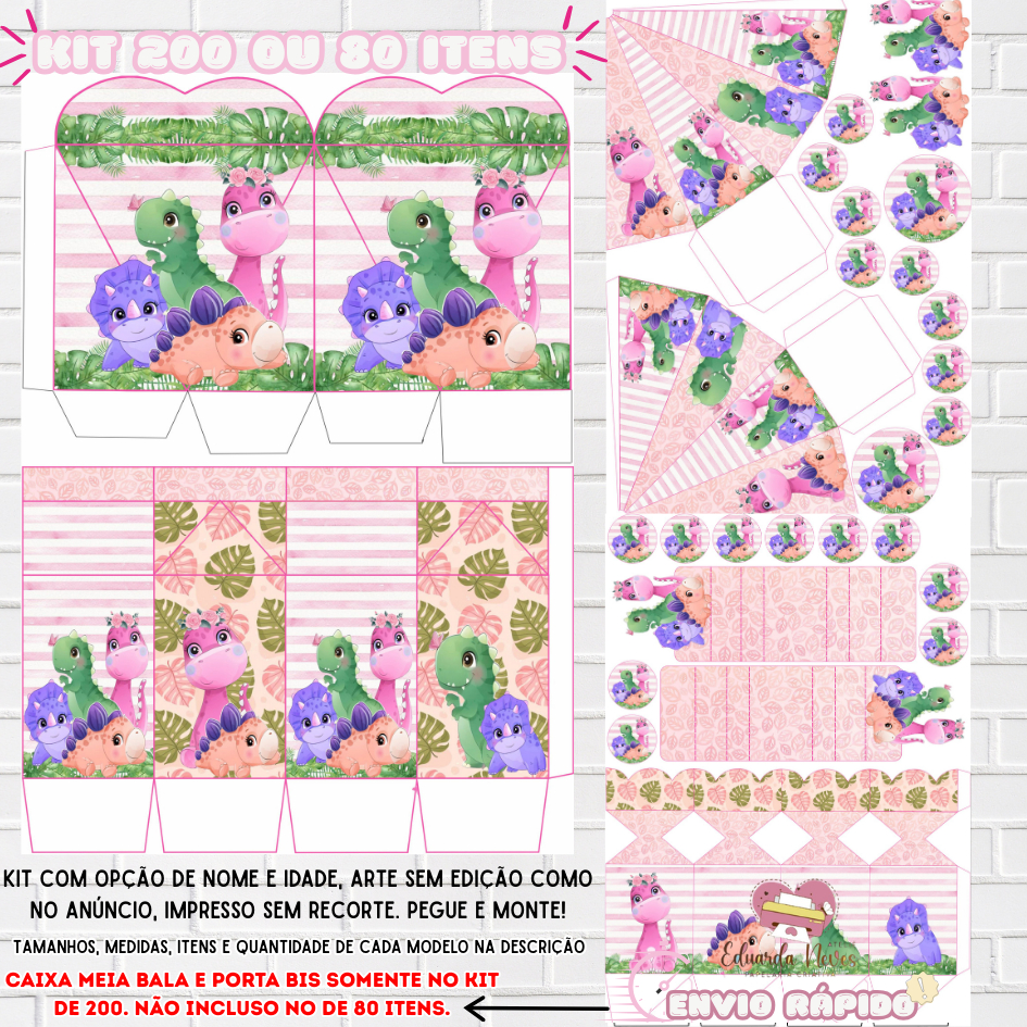 KIT LEMBRANCINHAS PARA FESTA (200/80) (CAIXAS, APLIQUES E TAGS) (COM/SEM NOME) TEMA:DINOSSAURO BABY