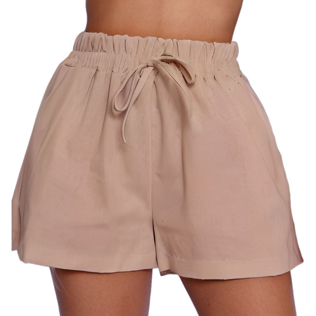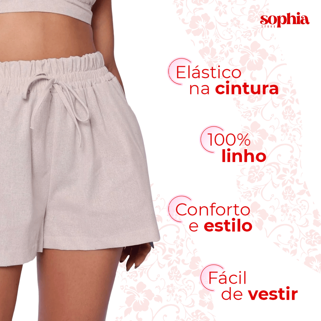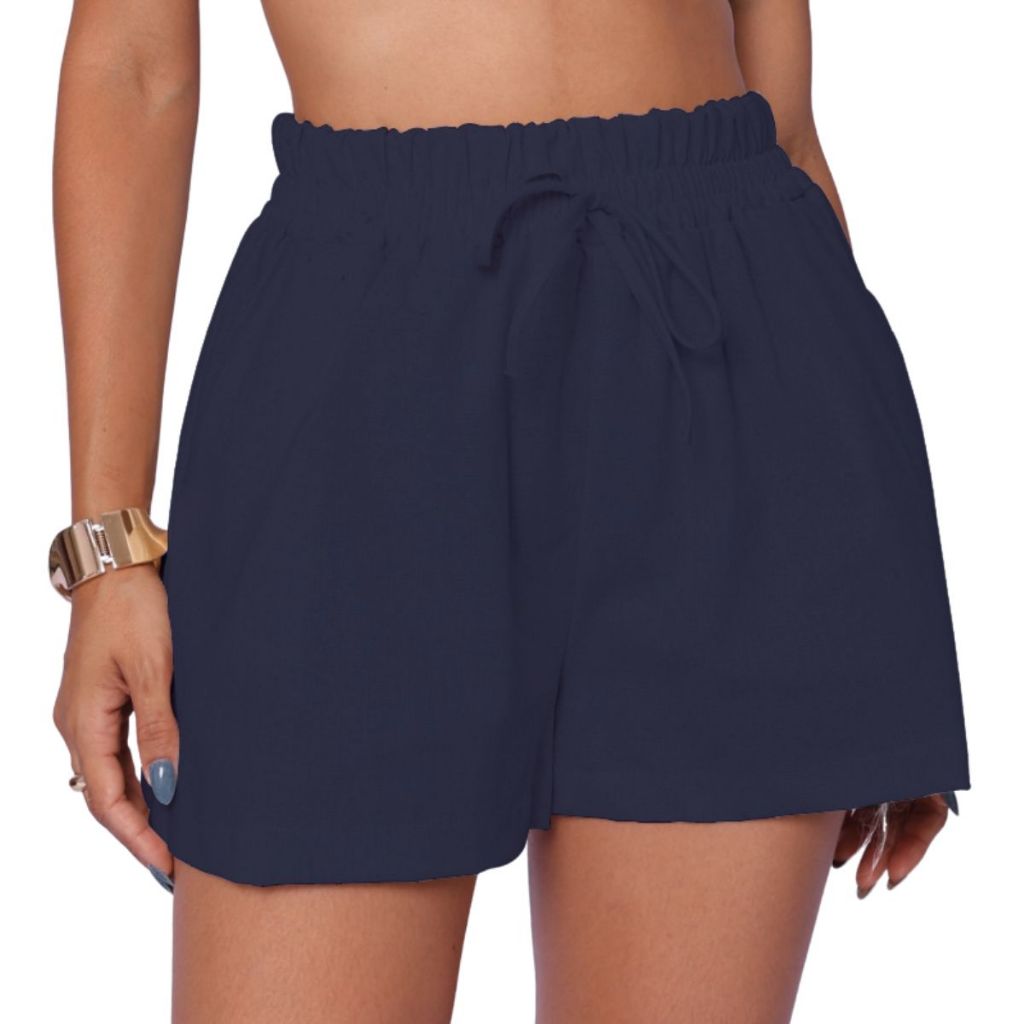 Short Bermuda Feminino Em Linho Cintura Alta Com Elástico Verão