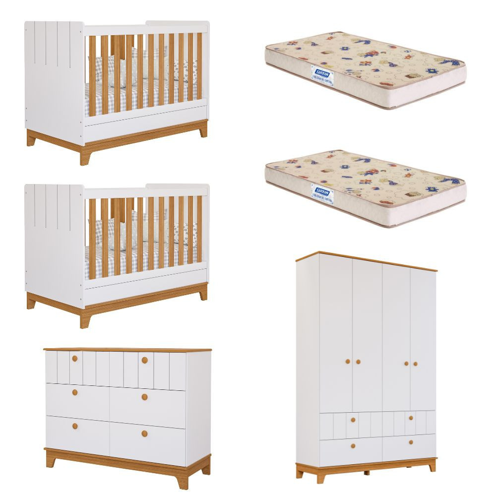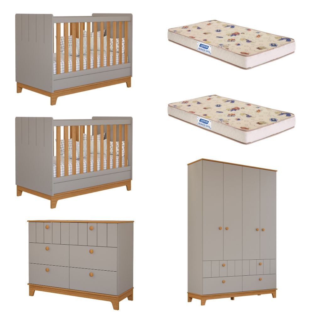 Quarto Bebê Gêmeos com 2 Berços Mini Cama Cômoda e Guarda Roupa Liza e 2 Colchões Gazin Permobili