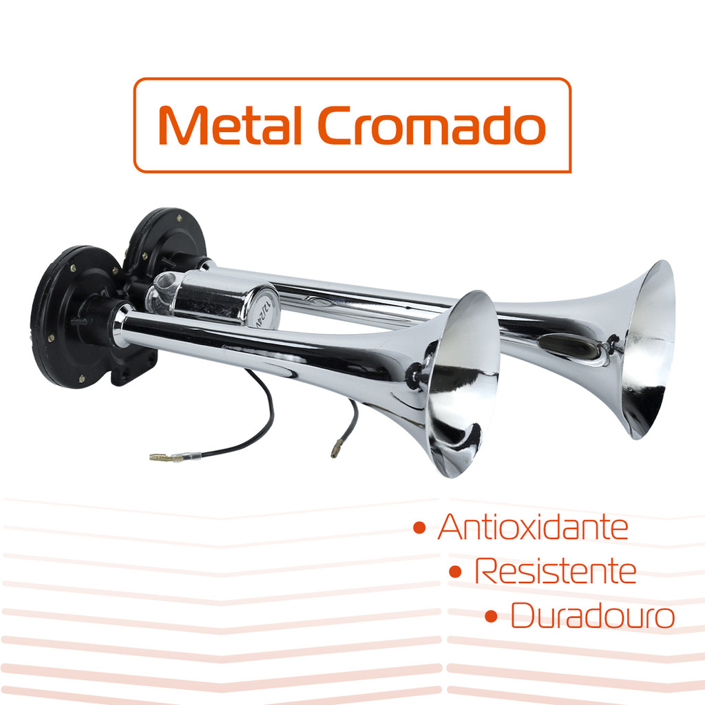 Buzina a Ar 2 Cornetas para Caminhão Metal Cromada 12V 24V Corneta Buzina Bratus Valvula Elétrica