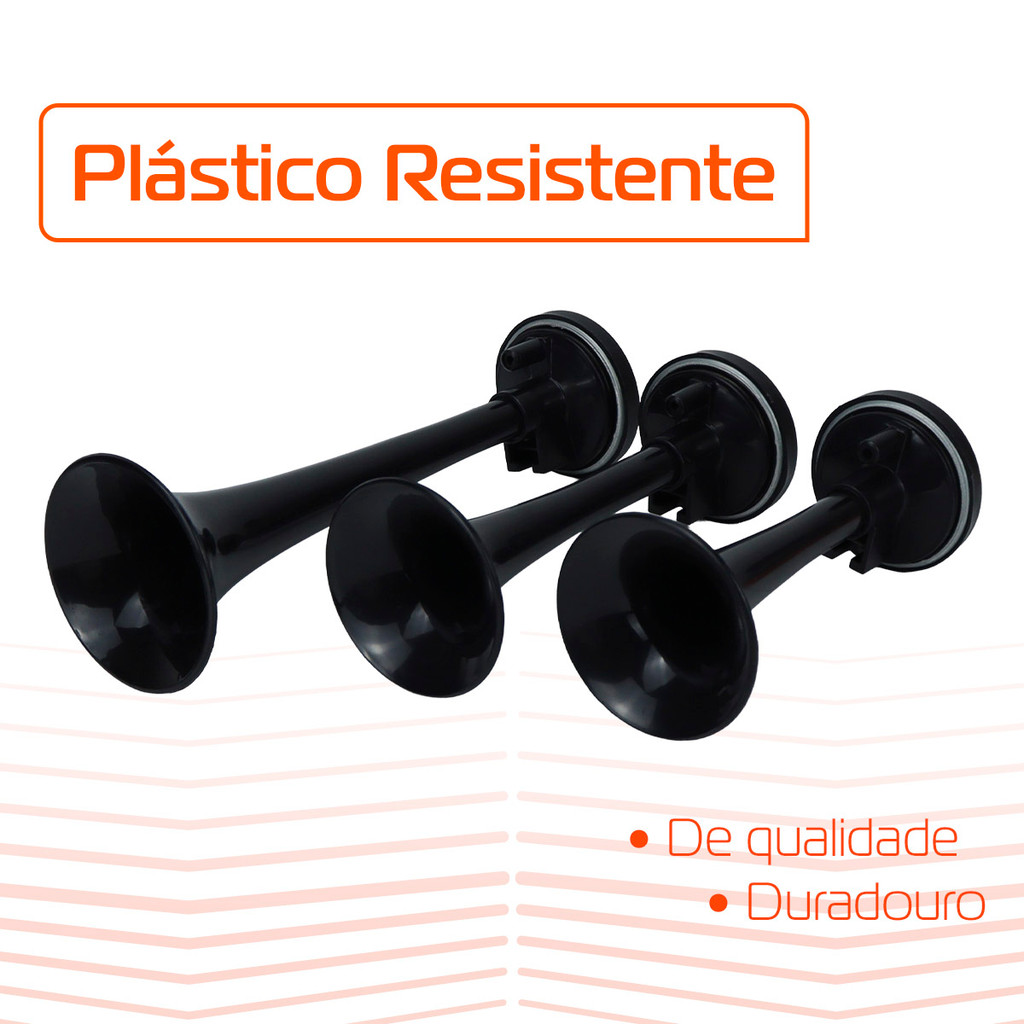 Buzina Ar Verdureiro Pneumática 3 Cornetas Ar Comprimido Caminhão Carro 12V 24V Preta Bratus