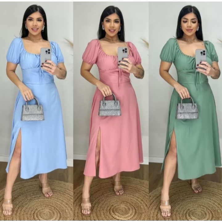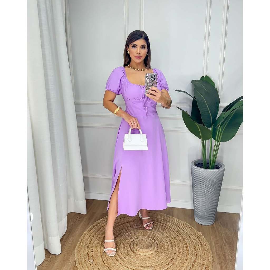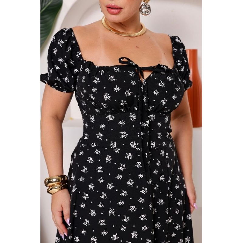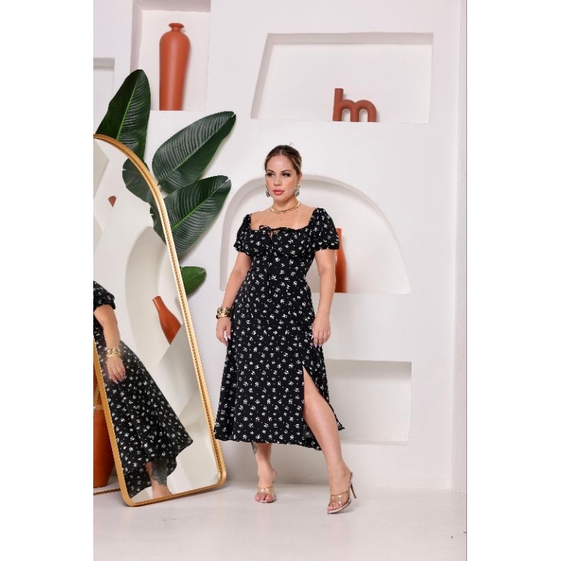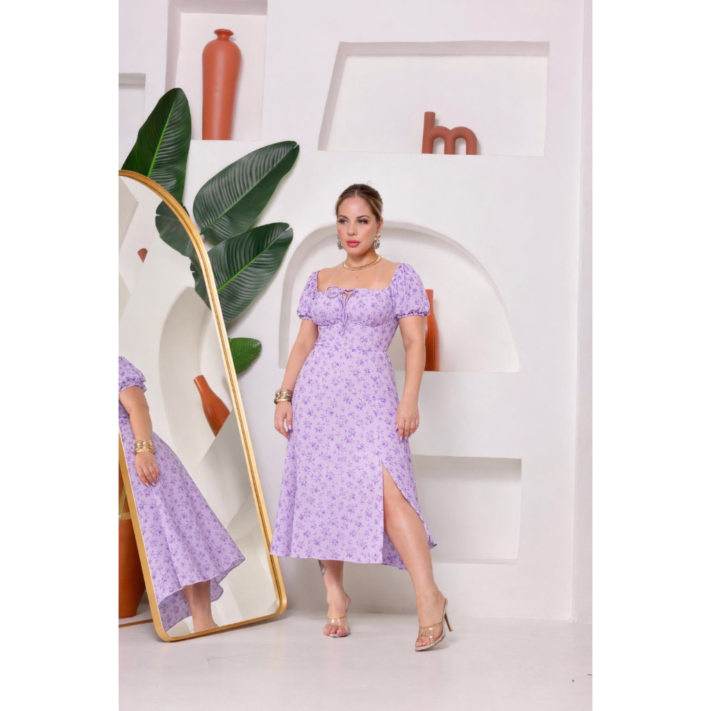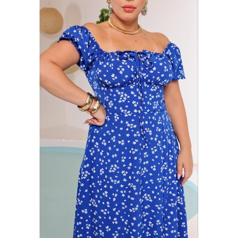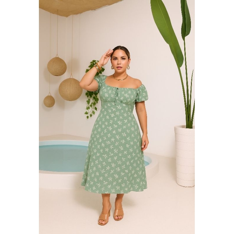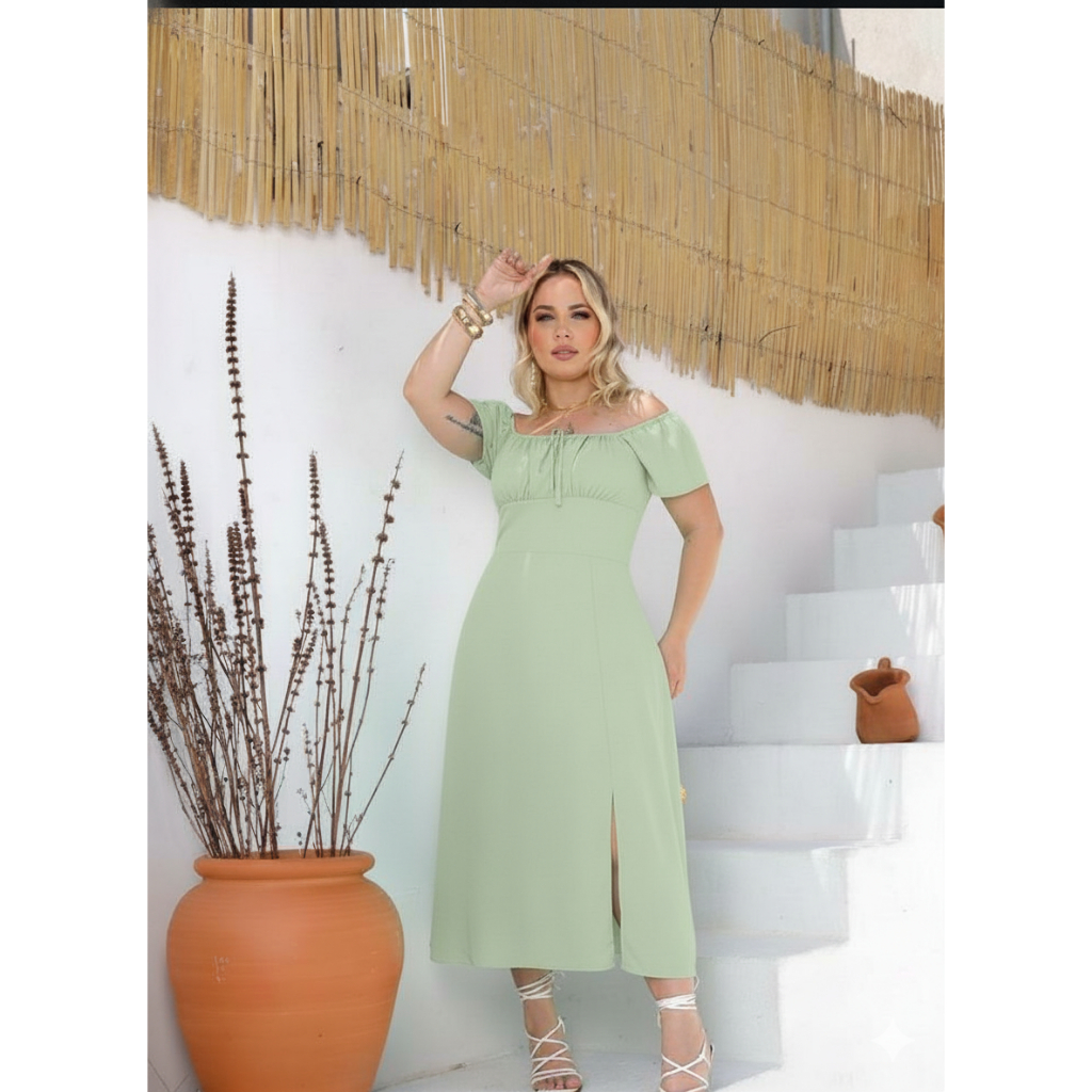 Vestido Midi Ombro a Ombro com Fenda PLUS SIZE –Manga Curta Caimento Fluido Elegante