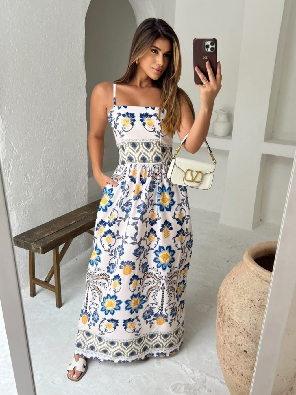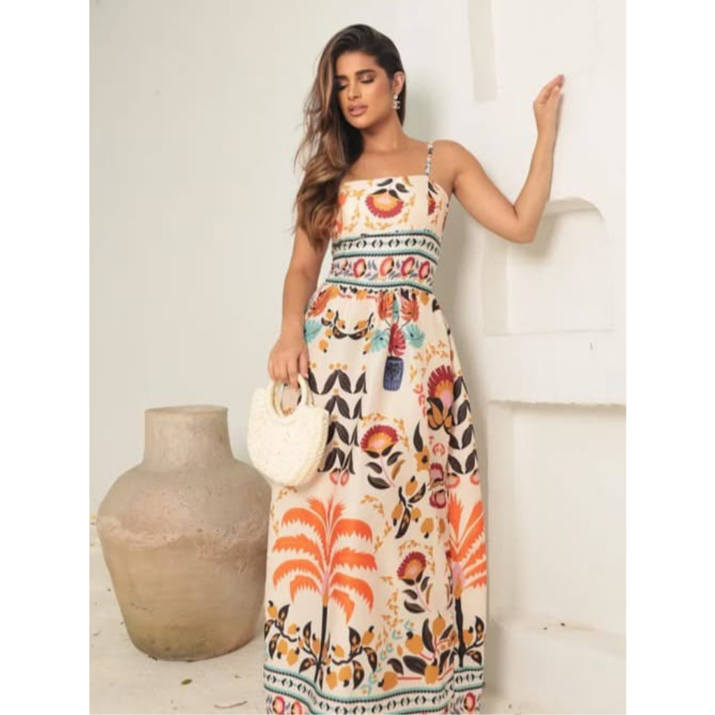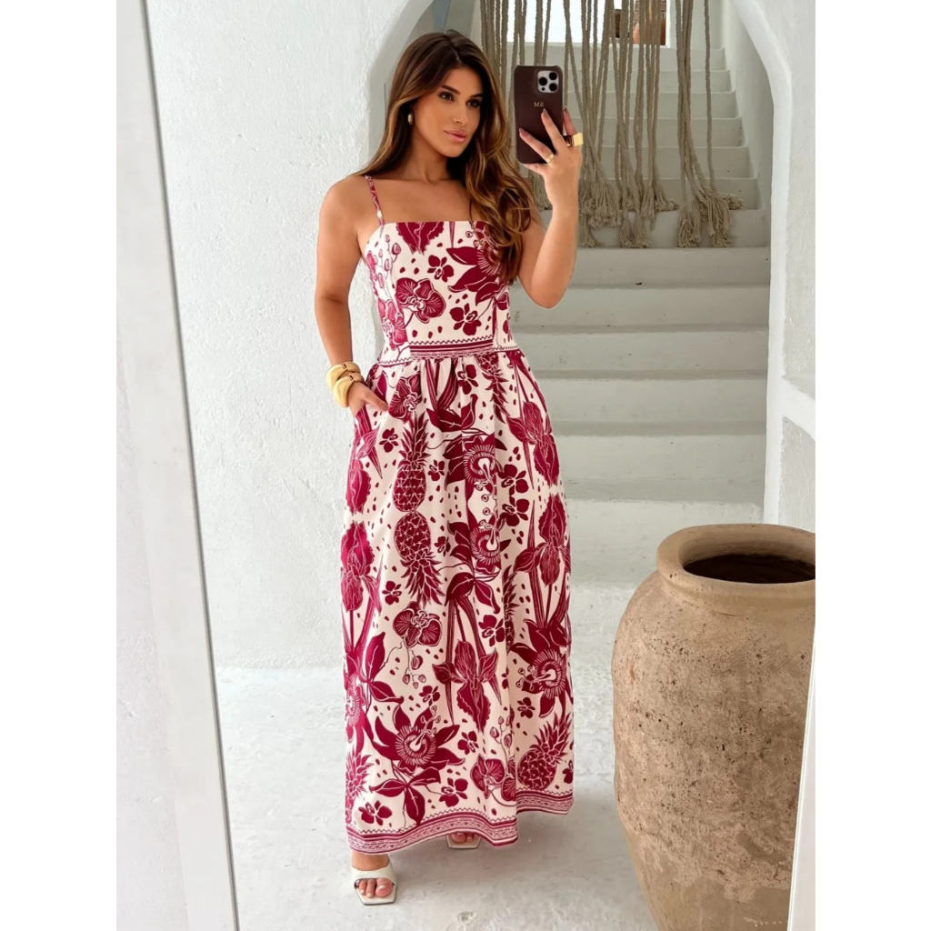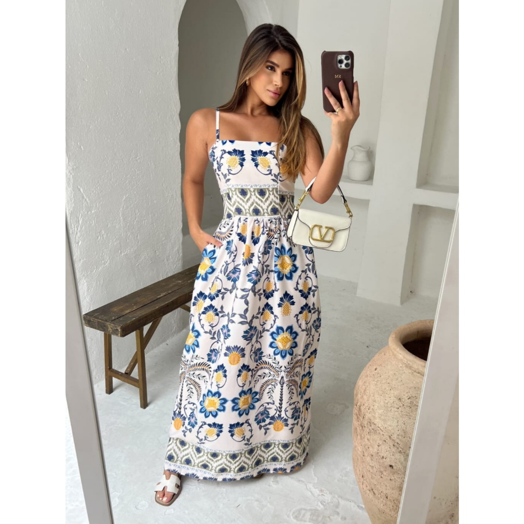 Vestido Longo Estampa Floral Tecido Fresco Crepinho com Bolsos -Tamanho Único.