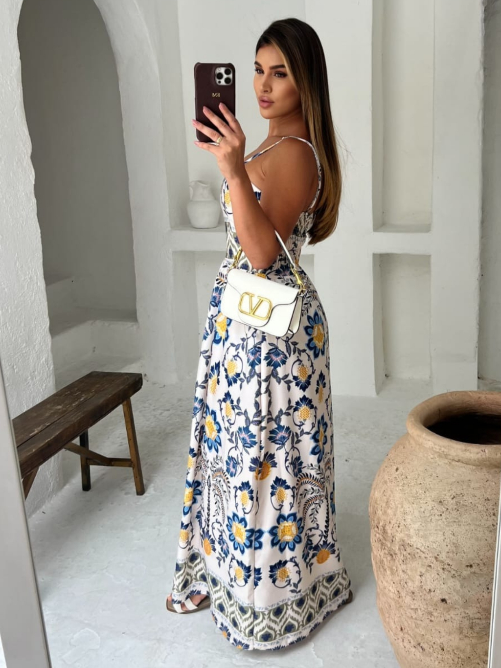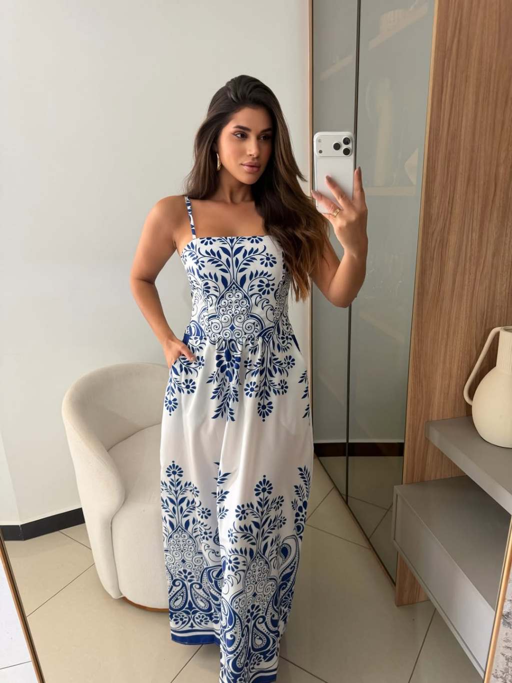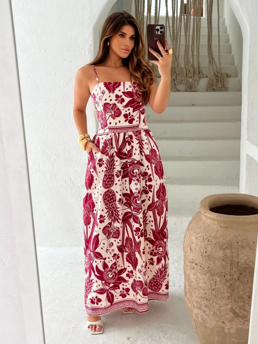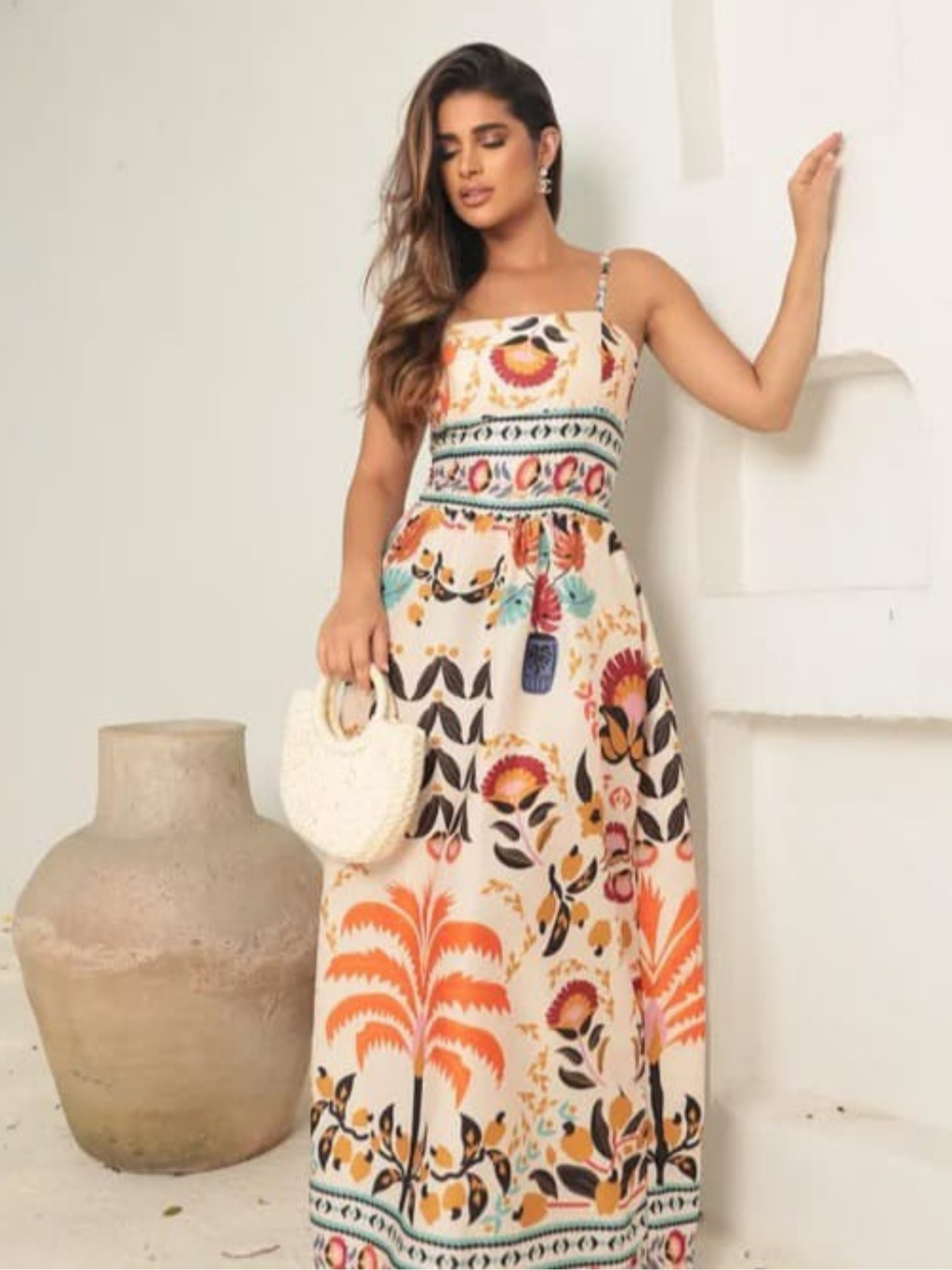 Vestido Longo Estampa Floral Tecido Fresco Crepinho com Bolsos -Tamanho Único.