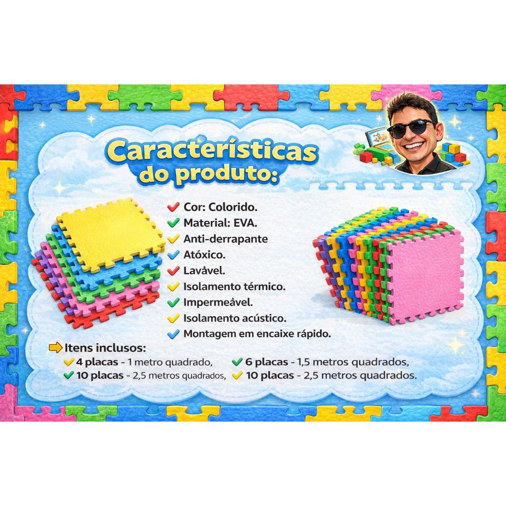 Kits 4,6 ou 10 unidades Tatame de EVA Colorido 50cm x 50cm x 1cm + Bordas de Brinde