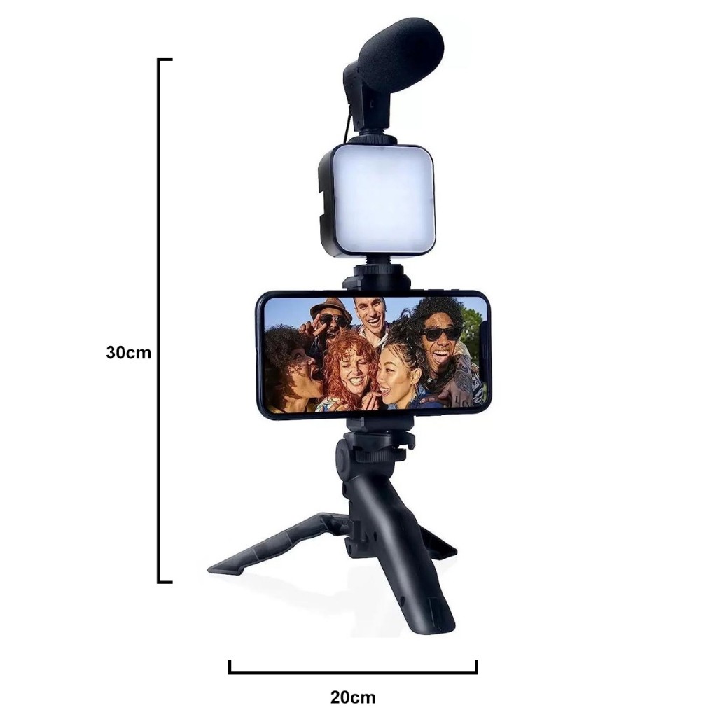 Kit Youtuber Tripé Vlog com Suporte para Celular, Luz LED e Microfone para Gravação de Vídeos