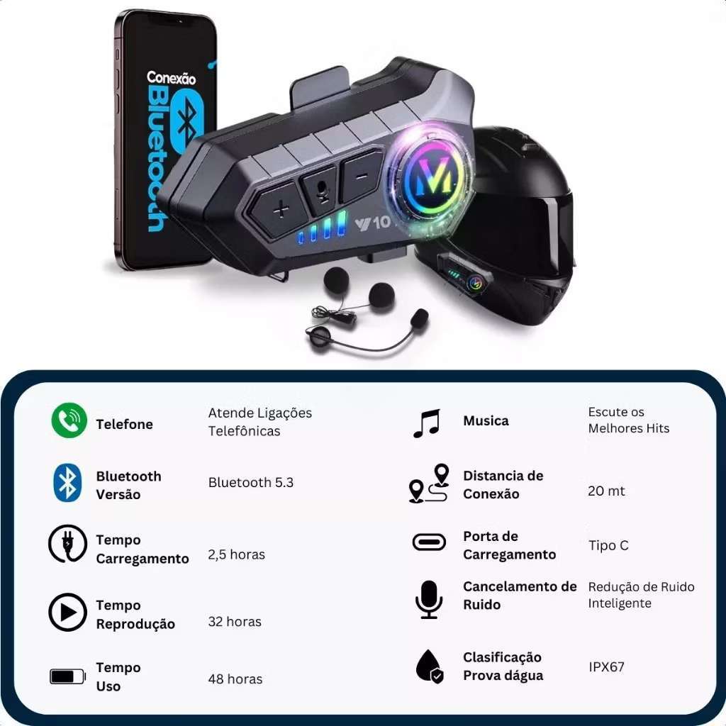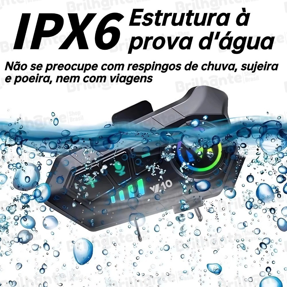 Intercomunicador para Capacete Moto Y10 Fone Bluetooth 5.3 Impermeável com Longa Bateria