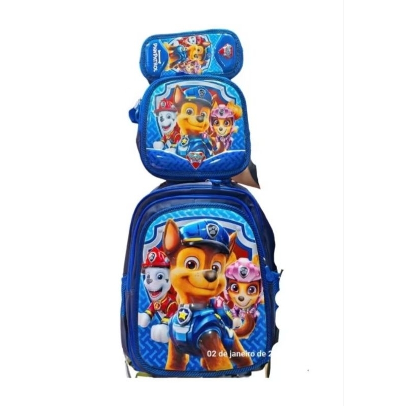 Kit Mochila Escolar Infantil Patrulha Canina 3D Com Carrinho Lancheira Térmica Estojo e Kit c/Canetinha Roblox Pikachu