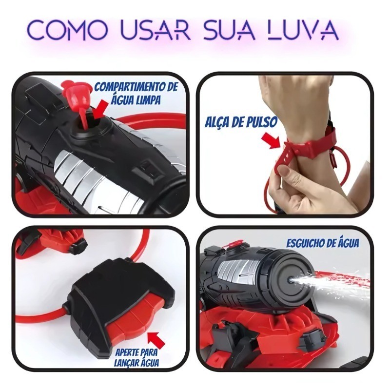 Luva Lança Água Jato Infantil Homem-Aranha Vermelha Brinquedo Divertido para Praia Piscina Kids Plus