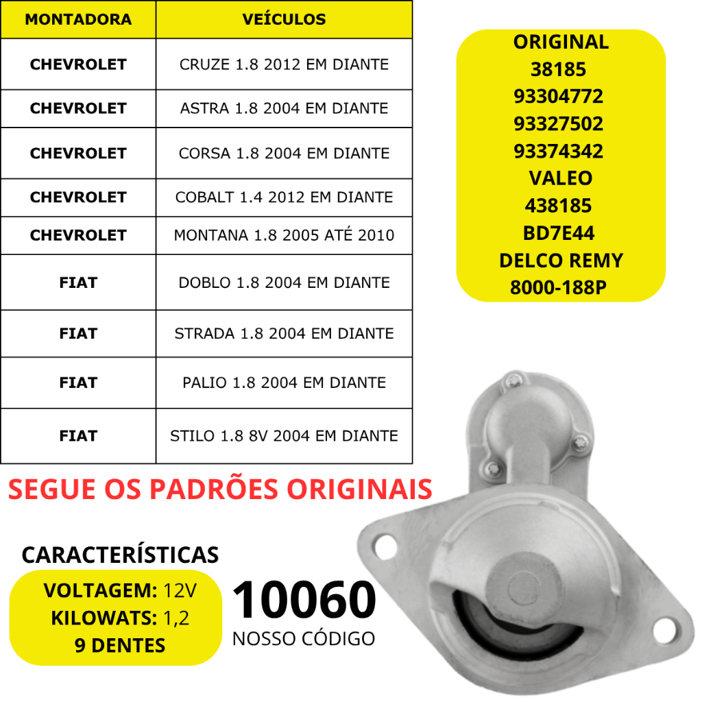 Motor de Partida Arranque Gm Cruze Meriva Corsa Cobalt Montana Fiat Doblo Palio Stilo Strada 1.4 1.8 2004 Em Diante