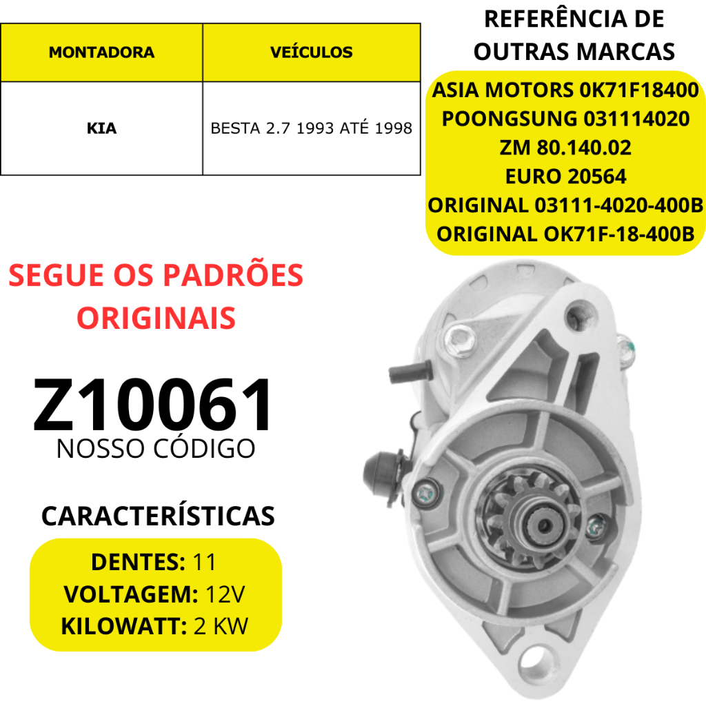 Motor de Partida Arranque 11 Dentes Para Kia Besta 2.7 1993 1994 1995 1996 1997 1998