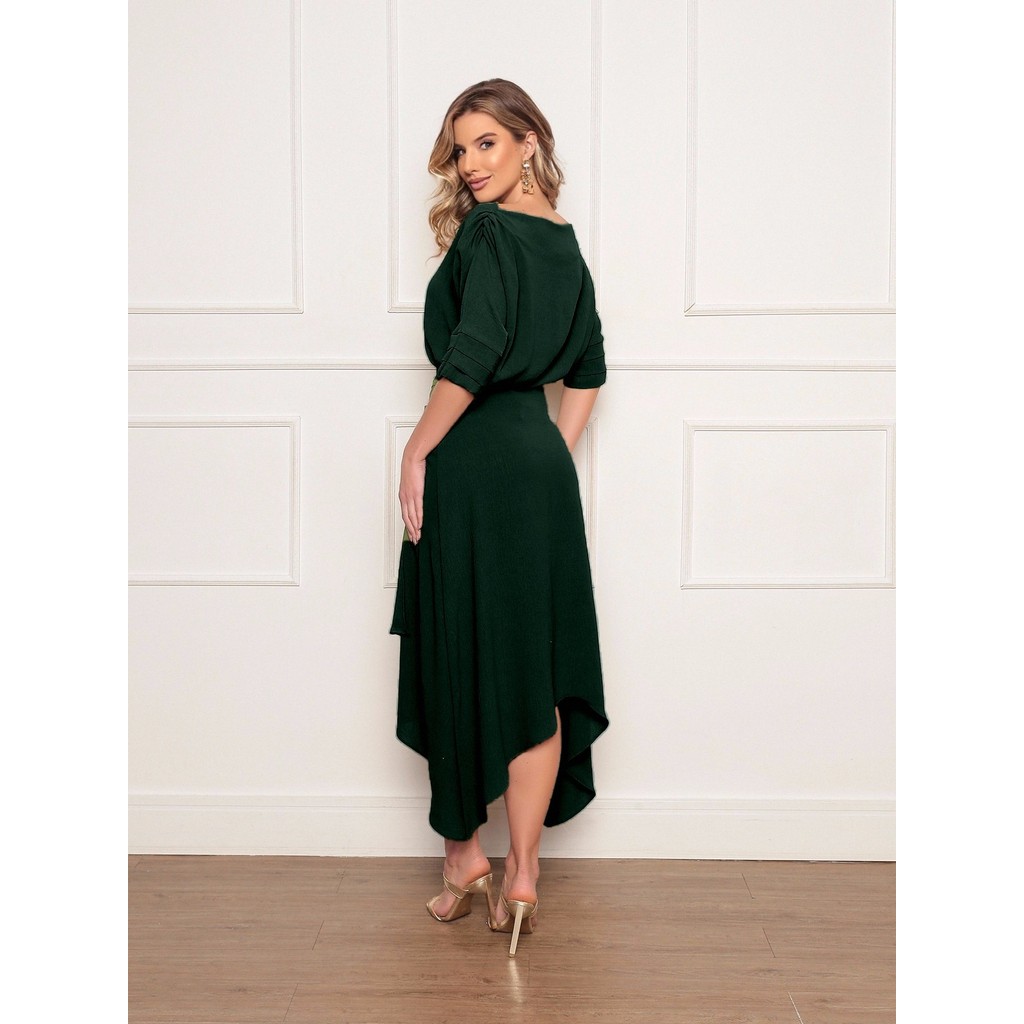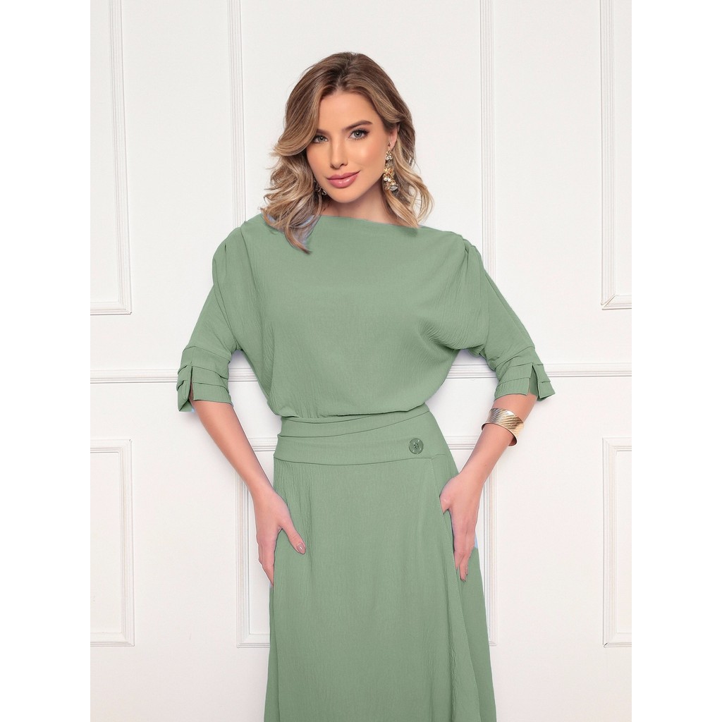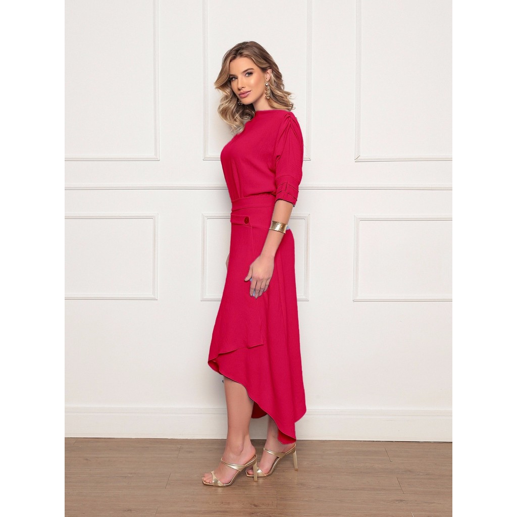 Conjunto Elegante Feminino em Tecido Duna com Blusa de Manga Dobrável e Saia Assimétrica com Botão Decorativo