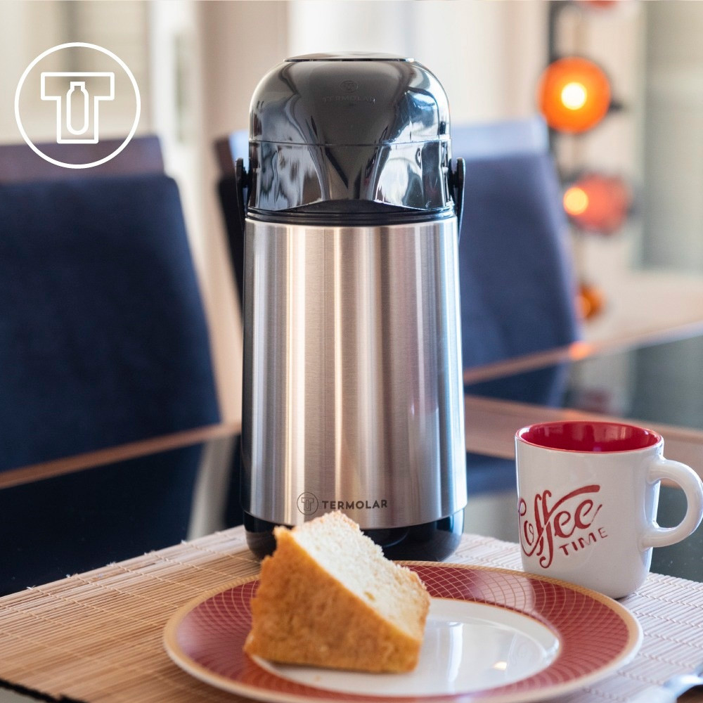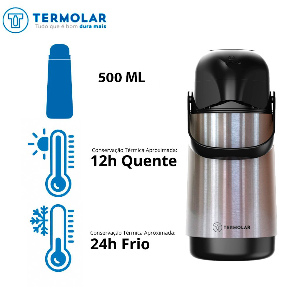 Kit com 2 Garrafas de Café Termolar de 500ml feita em Inox com Bomba de Pressão Bebidas Quentes Chá