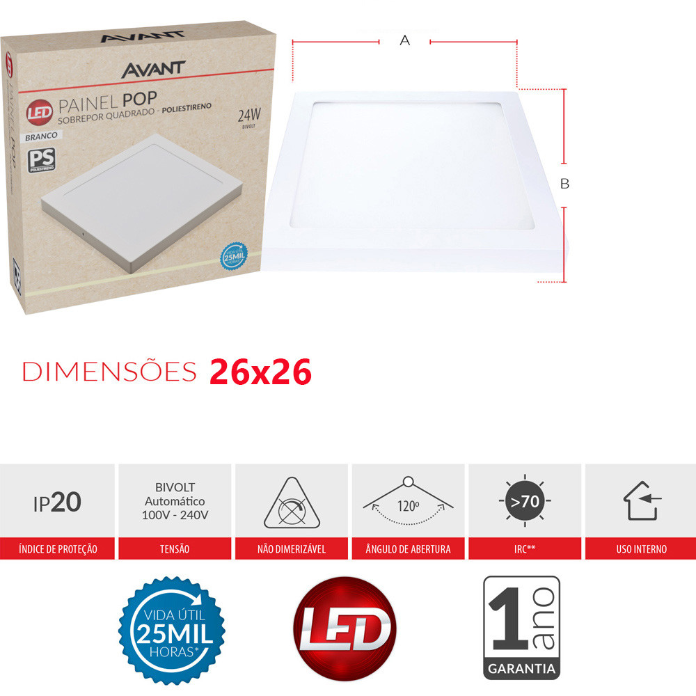 Kit 6 Painel Plafon Sobrepor Quadrado 24w Luz Branco Frio 6500K Bivolt Avant