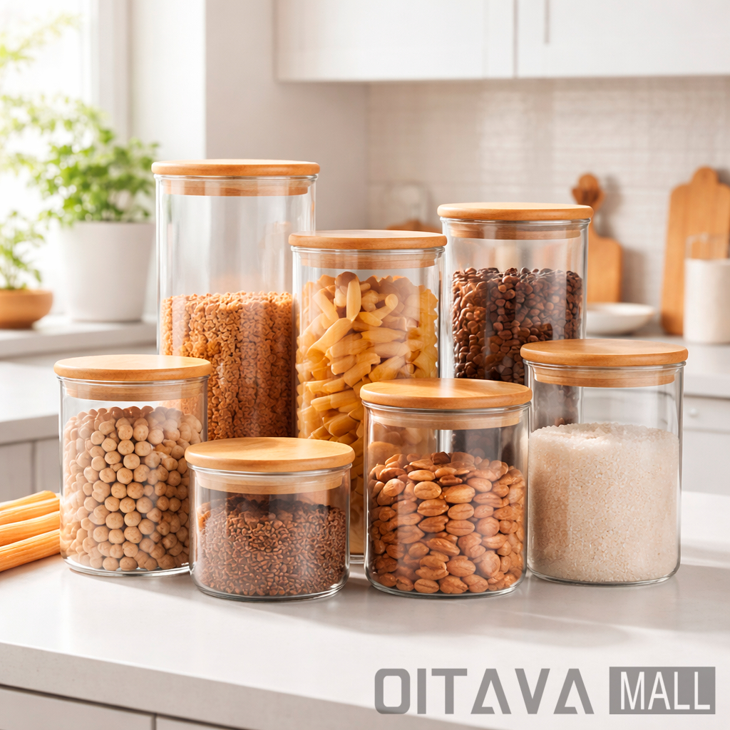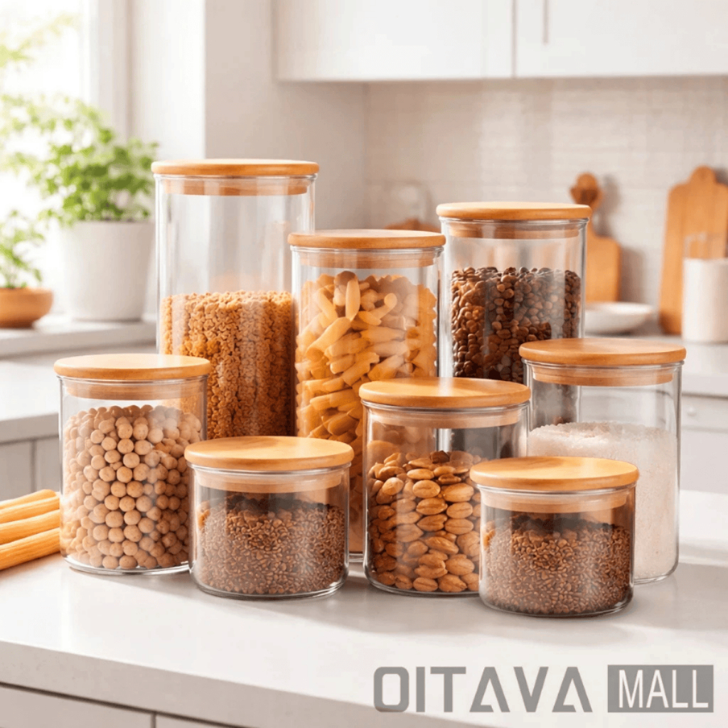 Kit Potes De Vidro Tampa De Bambu Recipiente de Armazenamento Vários Tamanhos Transparente