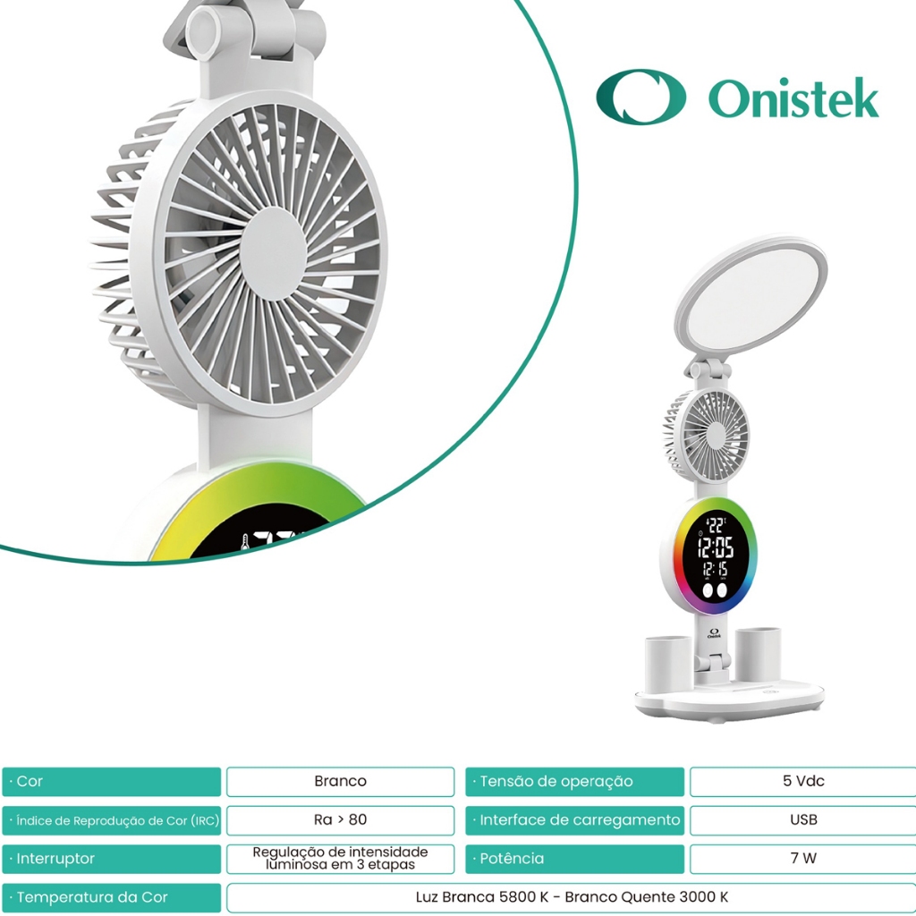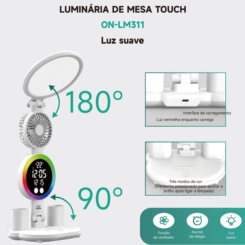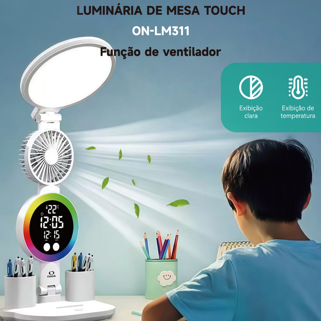 Luminária De Mesa Touch Com Ventilador Relógio E Temperatura