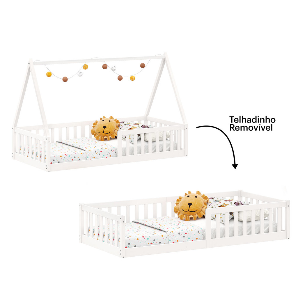 Cama Infantil Madeira Branco Grade Montessori Casinha de Chão Nicolas