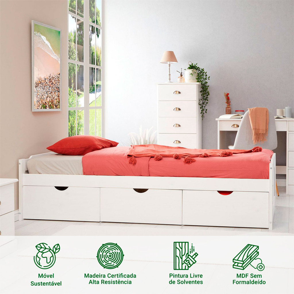 Cama Solteiro Madeira Maciça 3 Gavetas com Estrado Mia