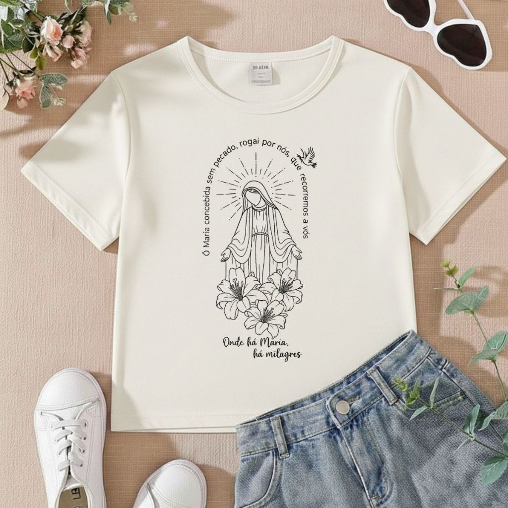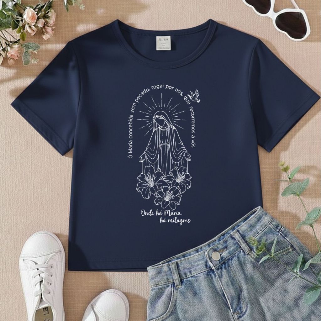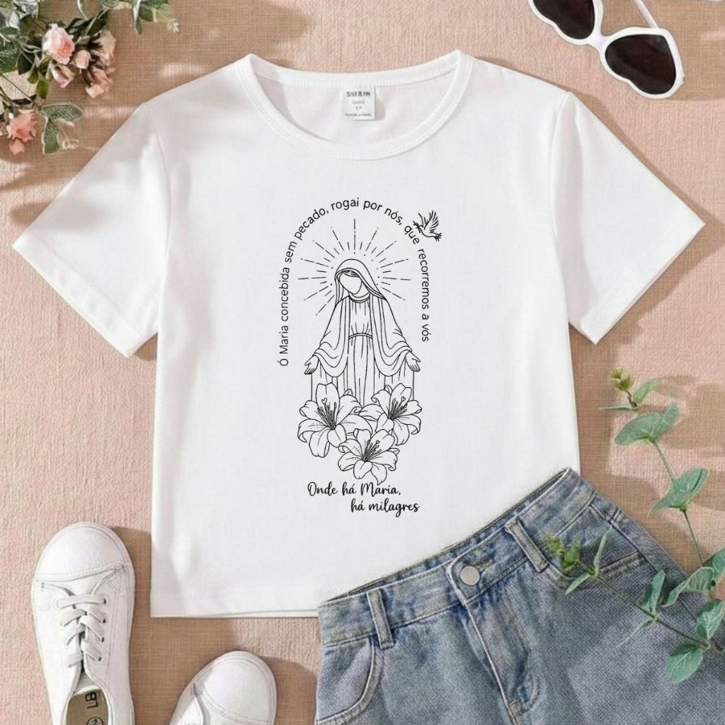 Tshirt Infantil Feminina Religiosa Onde há Maria a Milagres