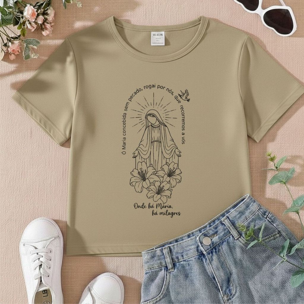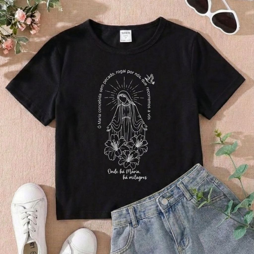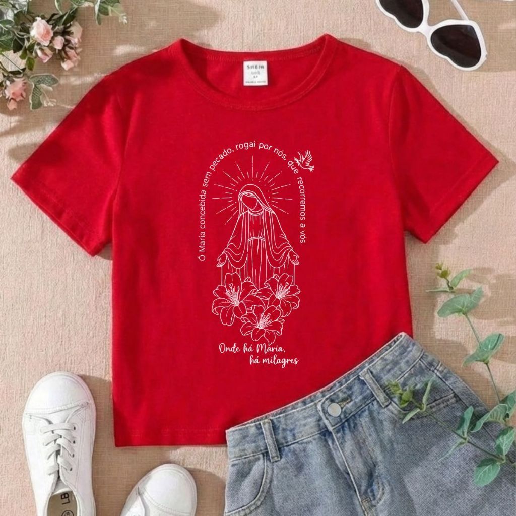 Tshirt Infantil Feminina Religiosa Onde há Maria a Milagres