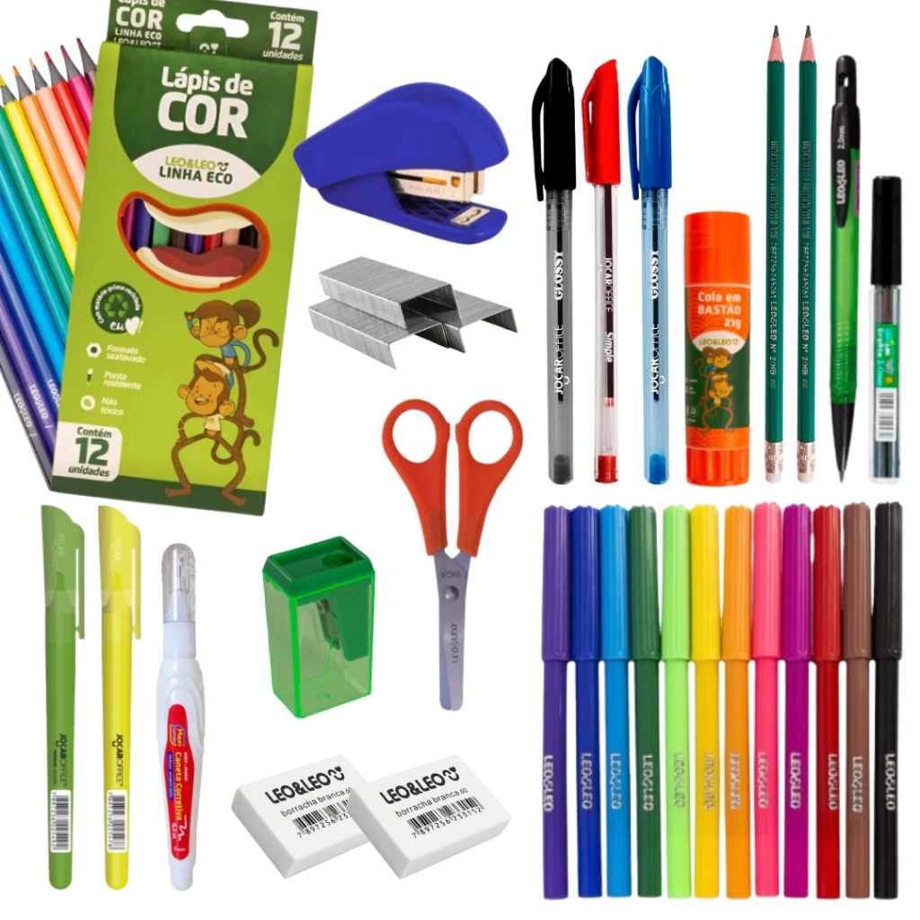 Kit Escolar Material Completo Lapis de Cor Hidrocor Caneta Apontador Borracha Juvenil Leo Leo