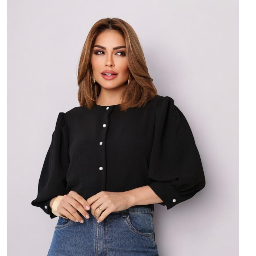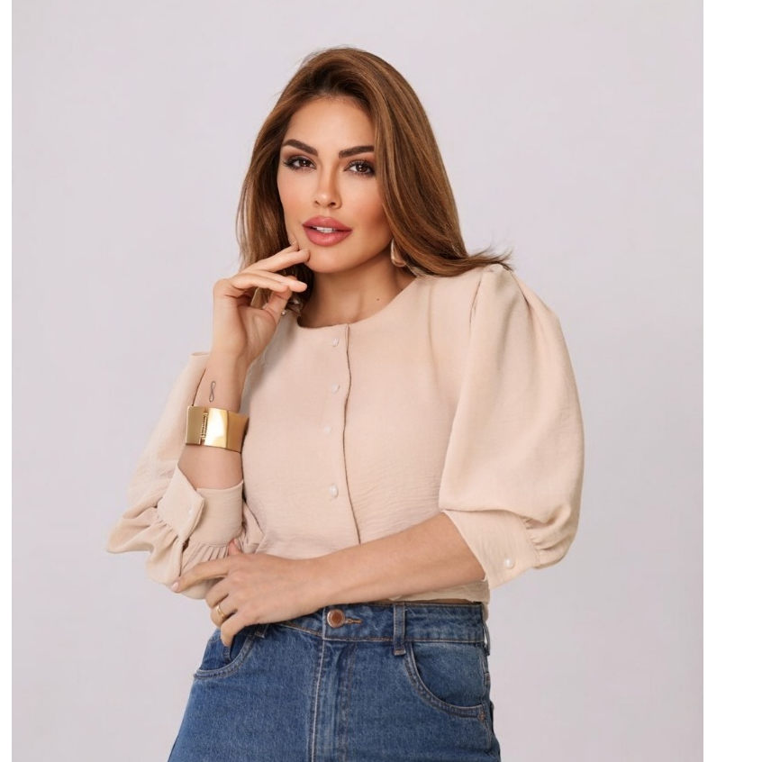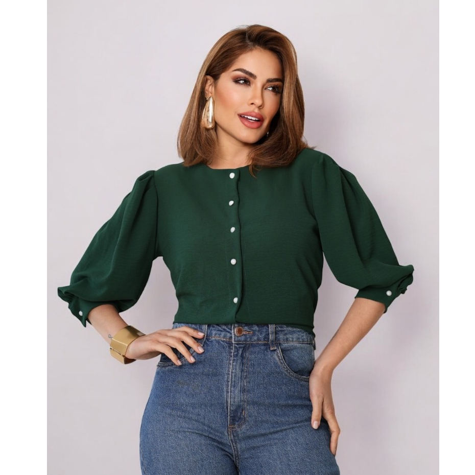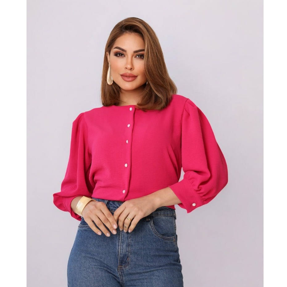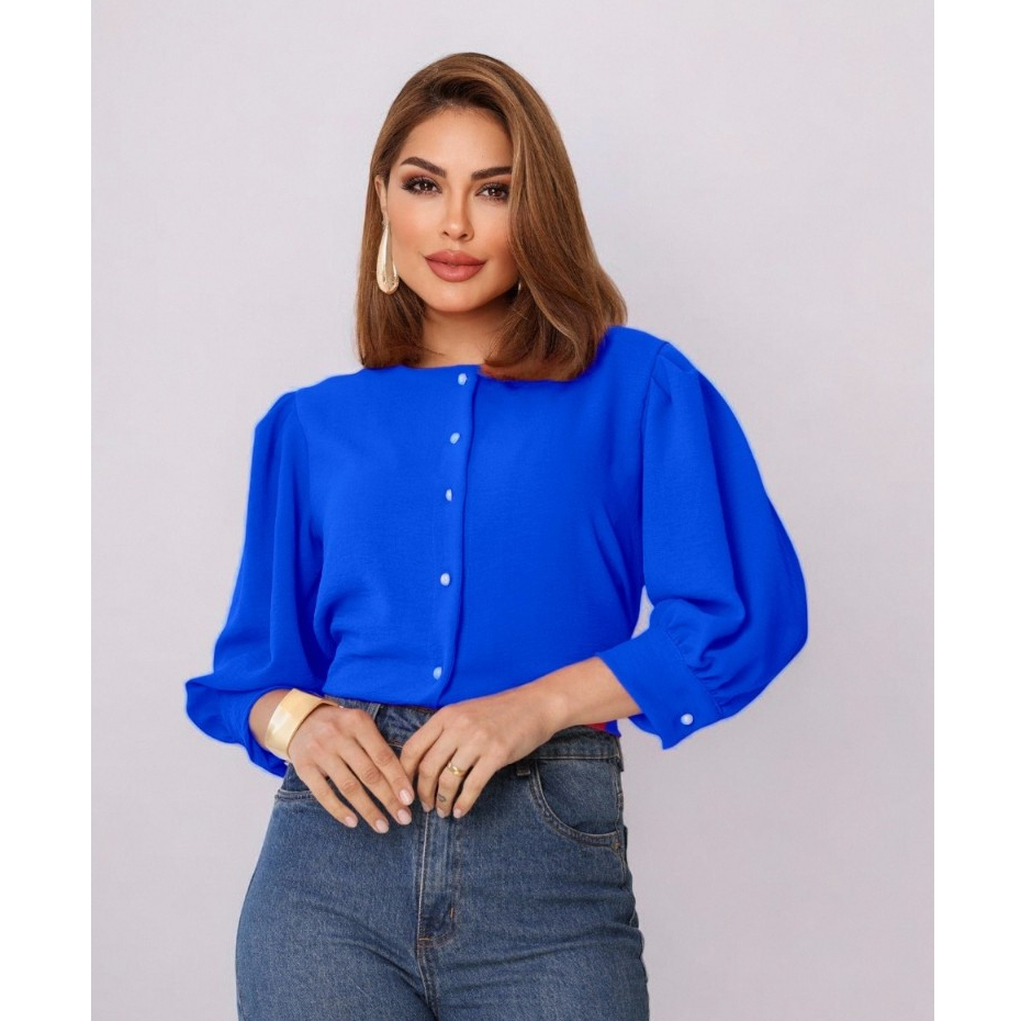 Smile Fashion camisa feminina manga 3/4 com botao abrir tecido duna