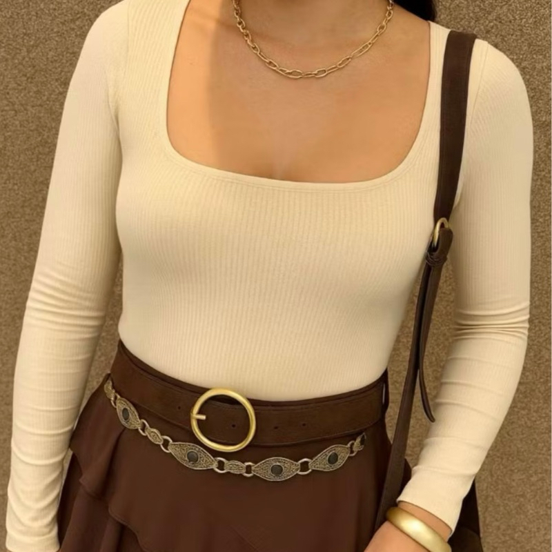 Blusa Manga Longa Gola Quadrada Malha Canelada Inverno Promoção