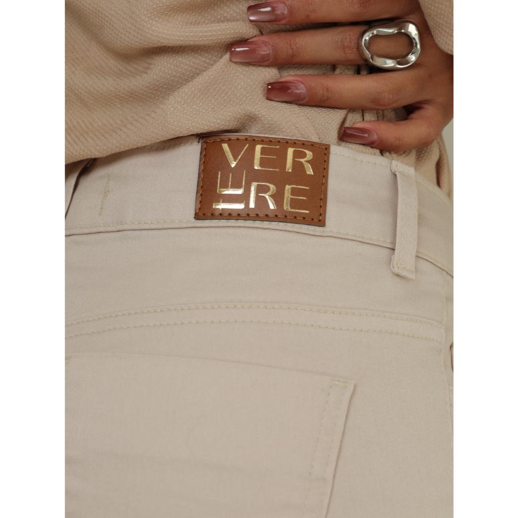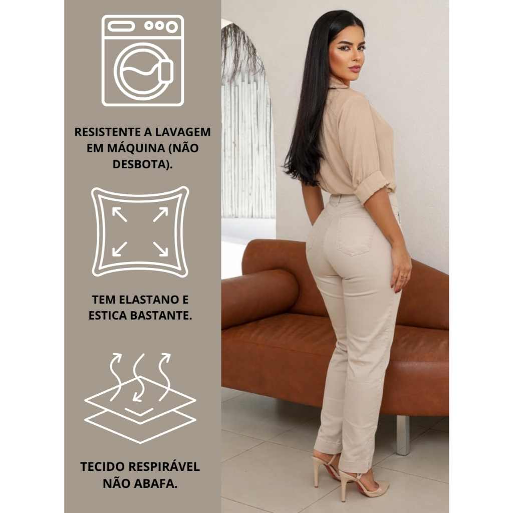 Calça Mom Sarja Feminina Cintura Alta Bege Cós Alto Modelagem Perfeita