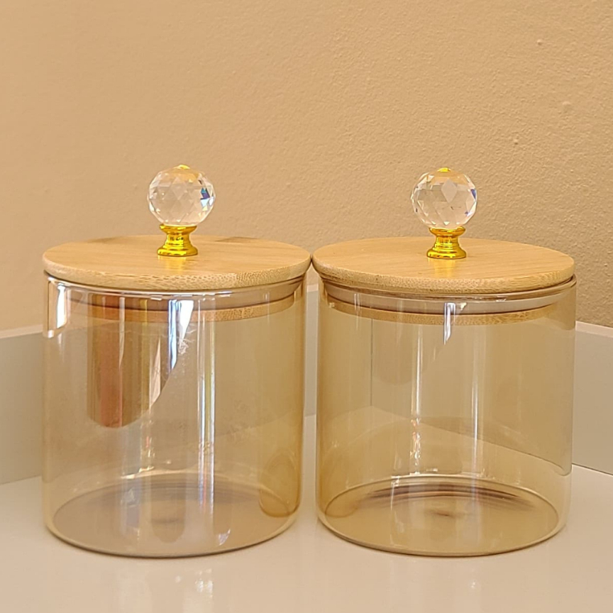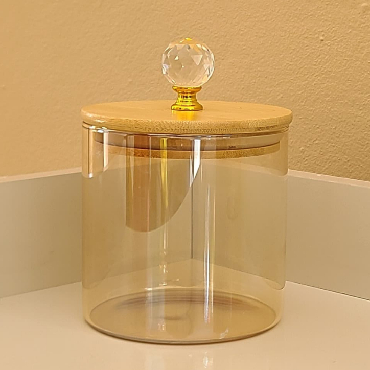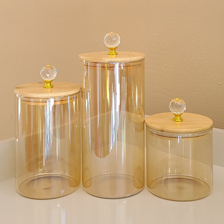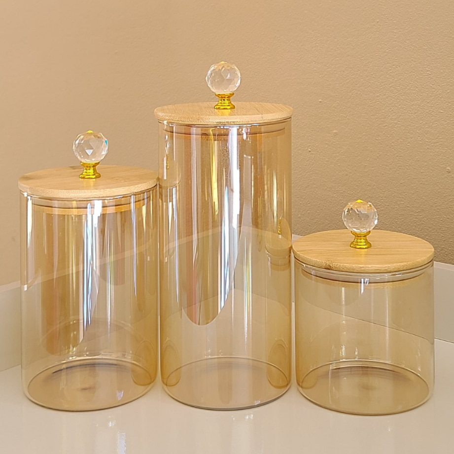 Pote de Vidro ÂMBAR CRISTAL LISO P Luxo hermético com tampa bambu 500ML Cozinha Porta Condimentos