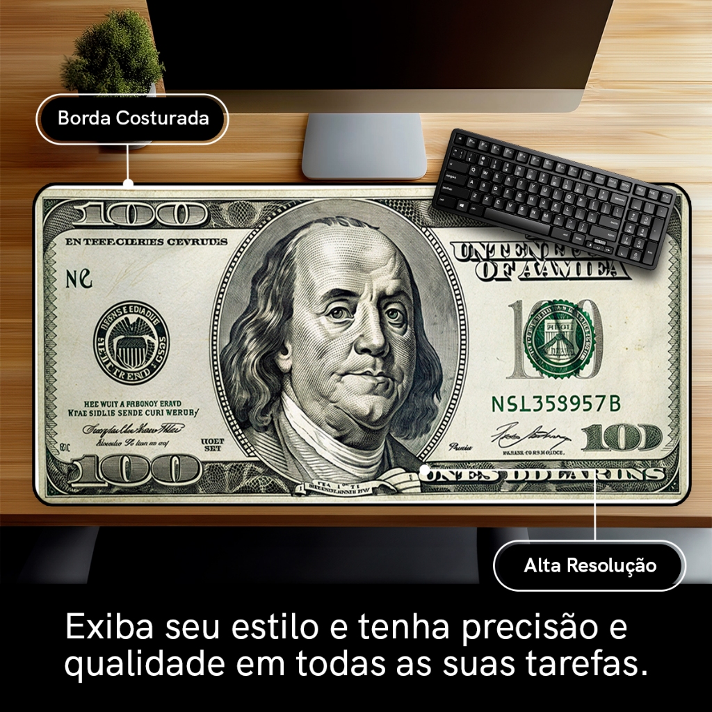 Mouse Pad Gamer Dollar Antiderrapante Grande 70x35 80x35 90x40 90x50 cm borda costurada
