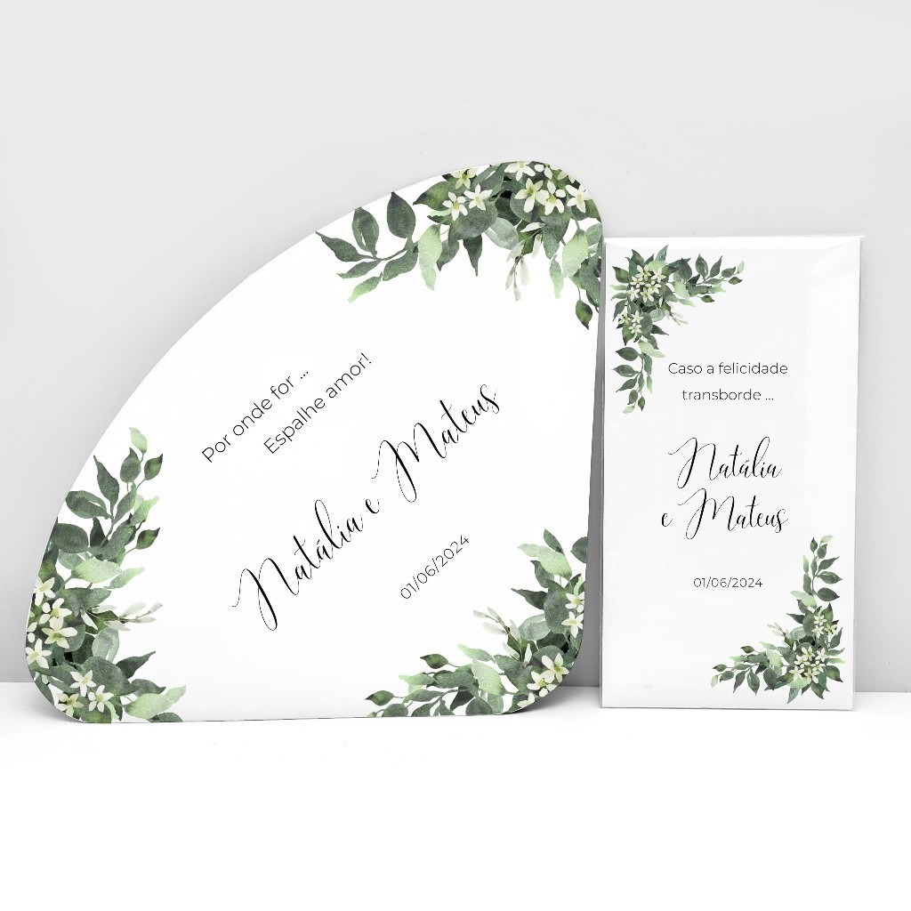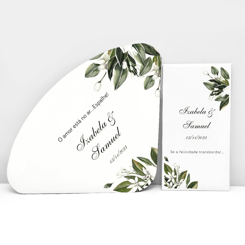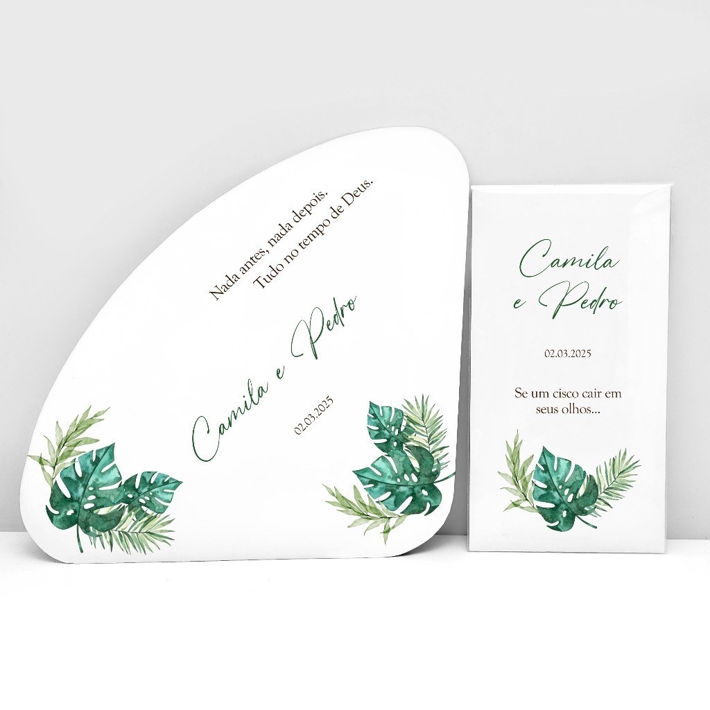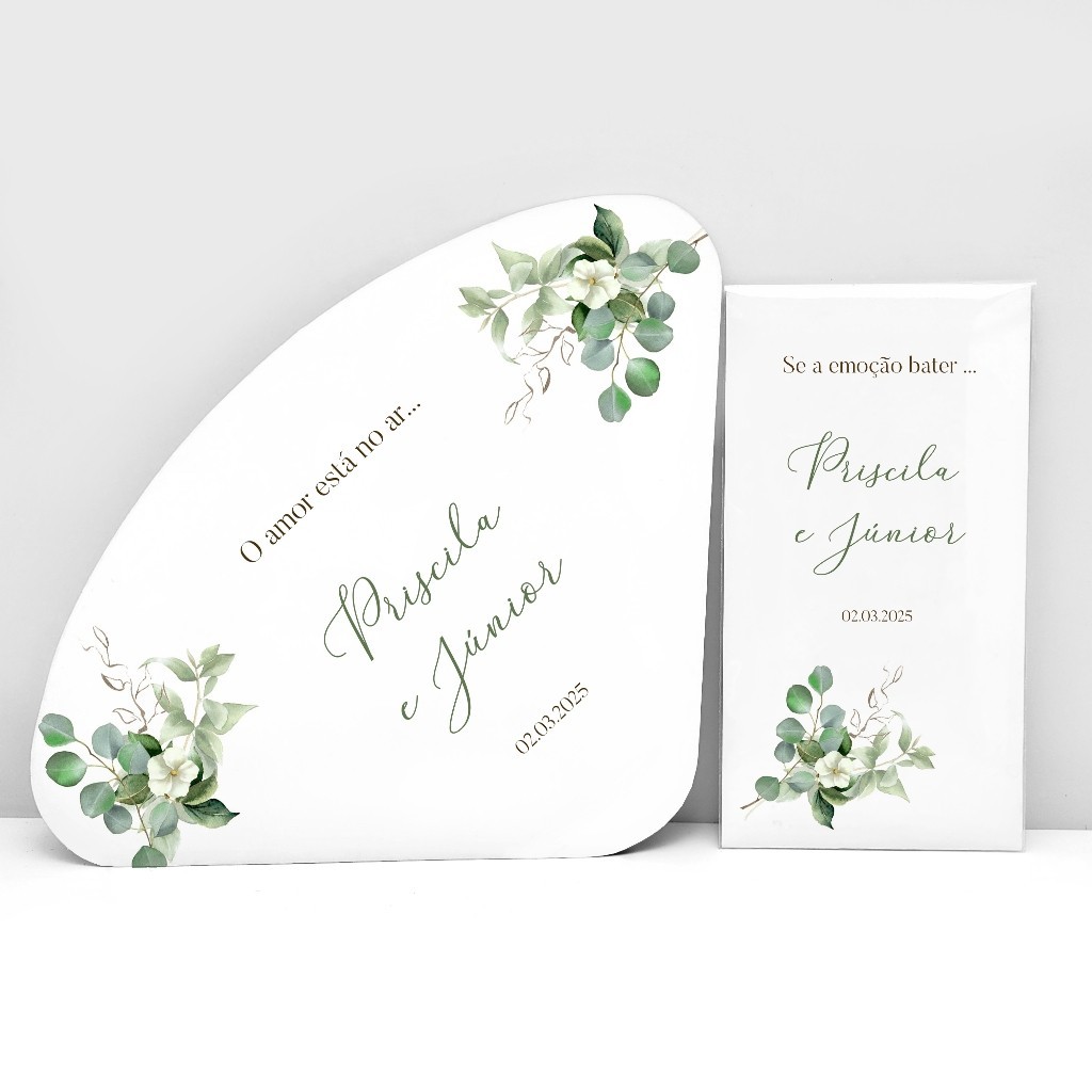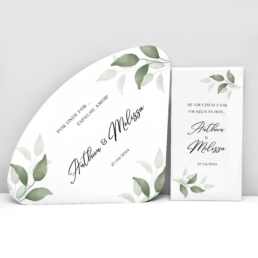 Kit Lágrimas de Alegria + Ventarolas Leques Personalizados Casamento Verde Folhagem Minimalista