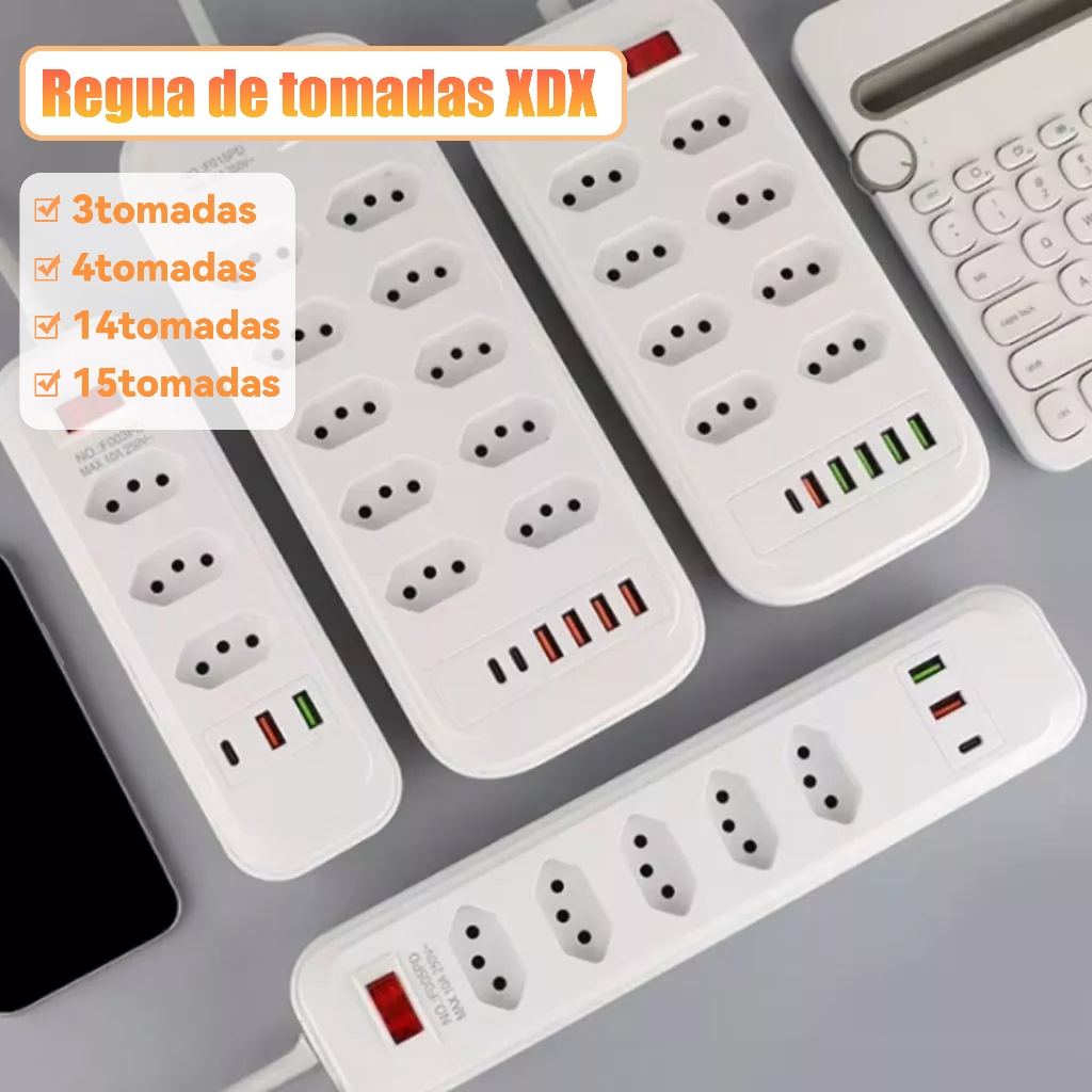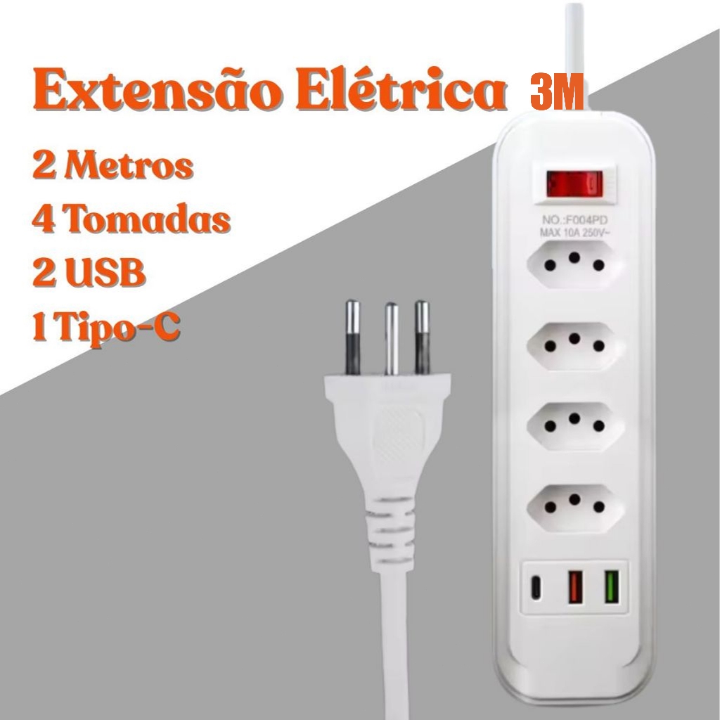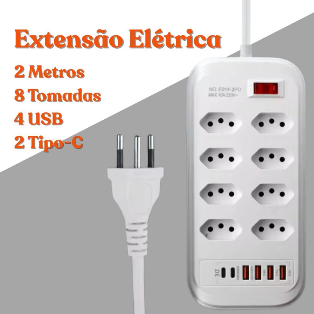 Extensão 3/4/5/6/8/10 Tomadas com Porta USB Tipo-C Régua Extensão Filtro de Linha 2 Metros Bivolt