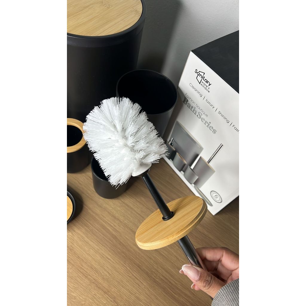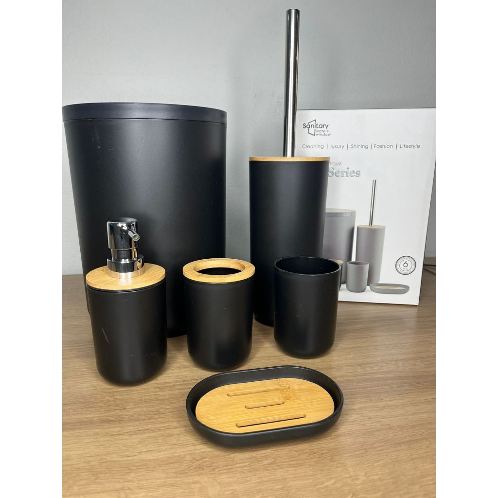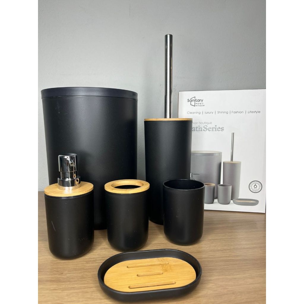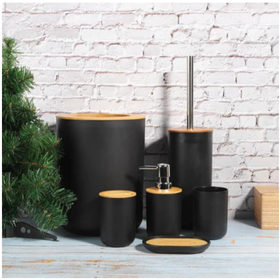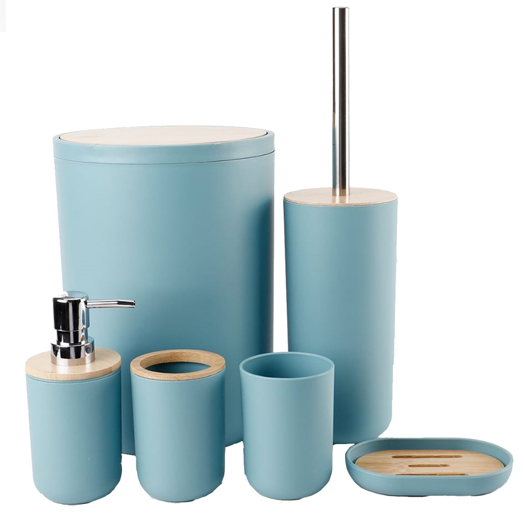 Kit Banheiro Premium 6 Peças Bambu Com Lixeira Saboneteira Azul