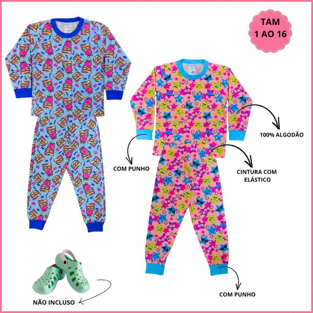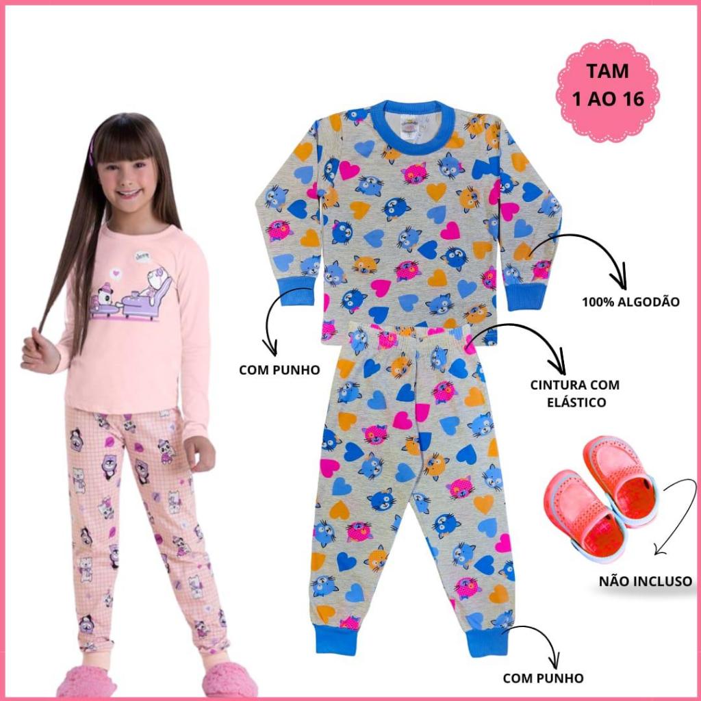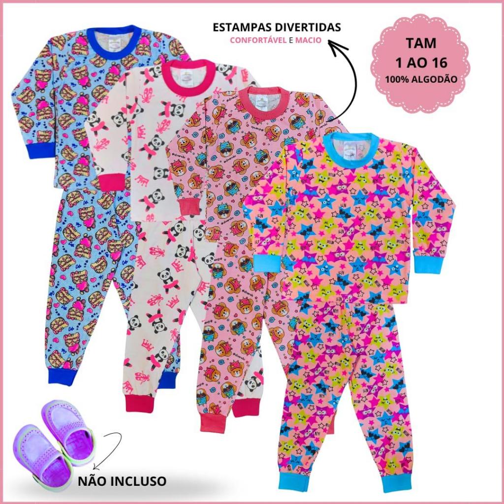 Kit 8 Peças Pijama Infantil Feminino Inverno 4 Camiseta Manga Longa e 4 Calça em Algodão 1 ao 16