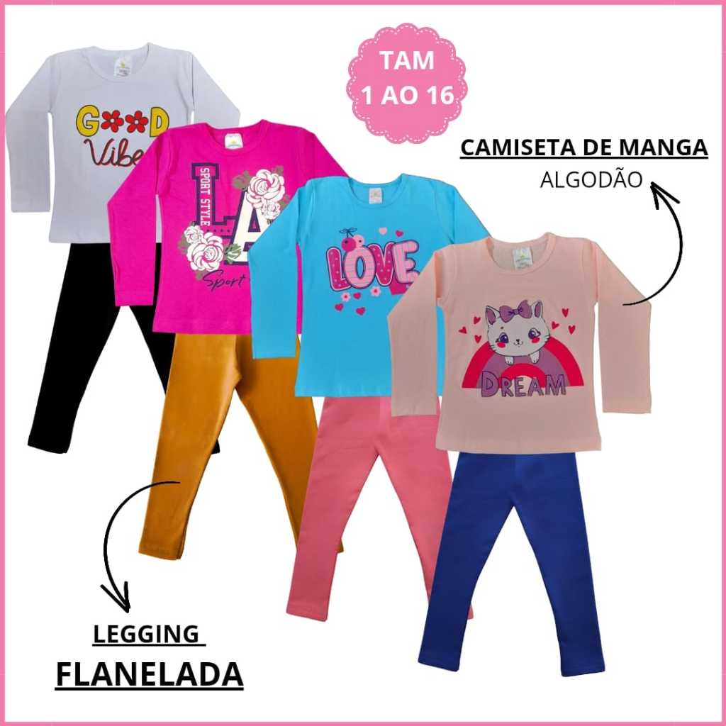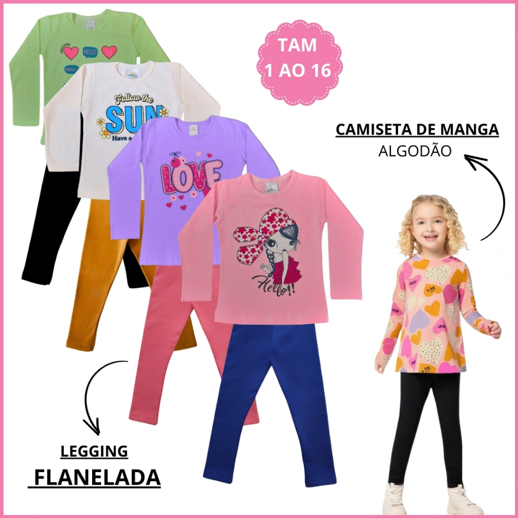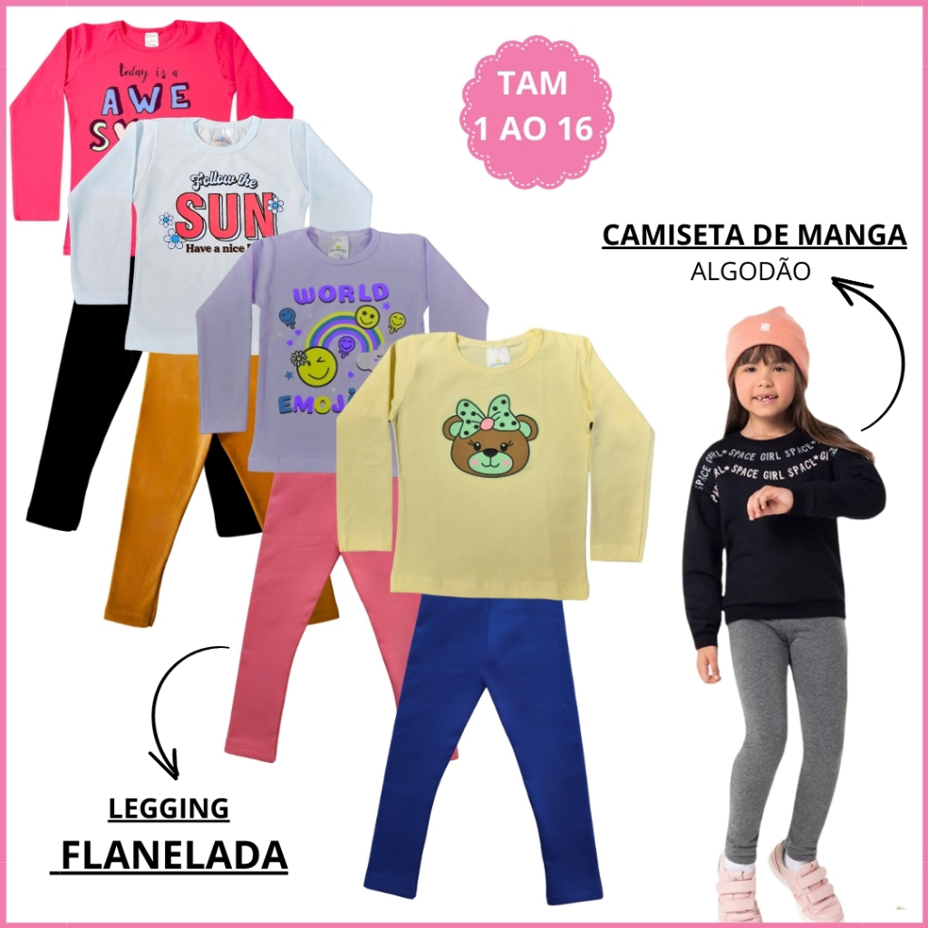 Kit 6 Peças Conjunto Infantil Feminino Camiseta Manga Legging Flanelada Peluciada Termica 1 ao 16