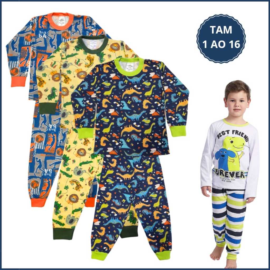Kit 4 Peças Pijama Infantil Menino Inverno 2 Camiseta Manga e 2 Calça Bebê ao Juvenil Cotton 1 ao 16