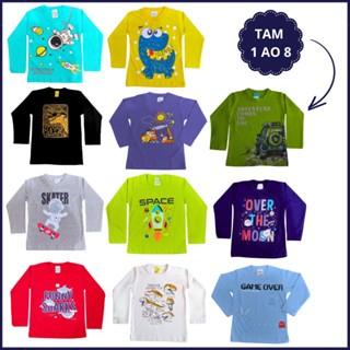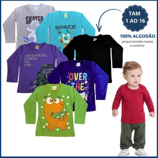 Kit 6 Camiseta Manga Longa Infantil Menino Masculino Meia Estação em Algodão Liso Estampado 1 ao 16
