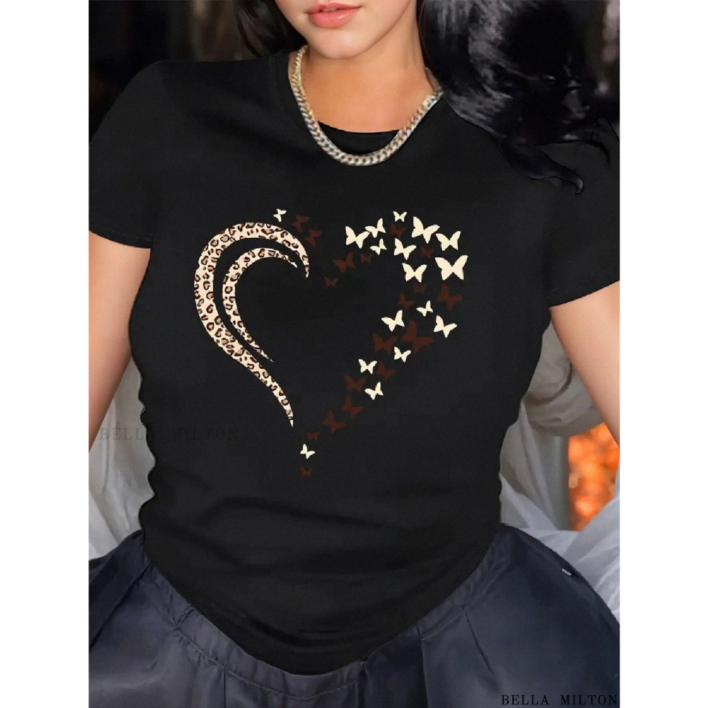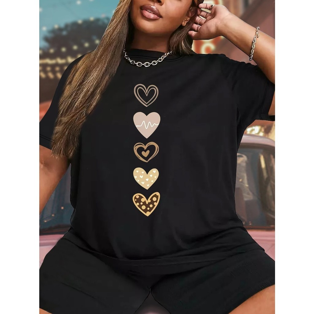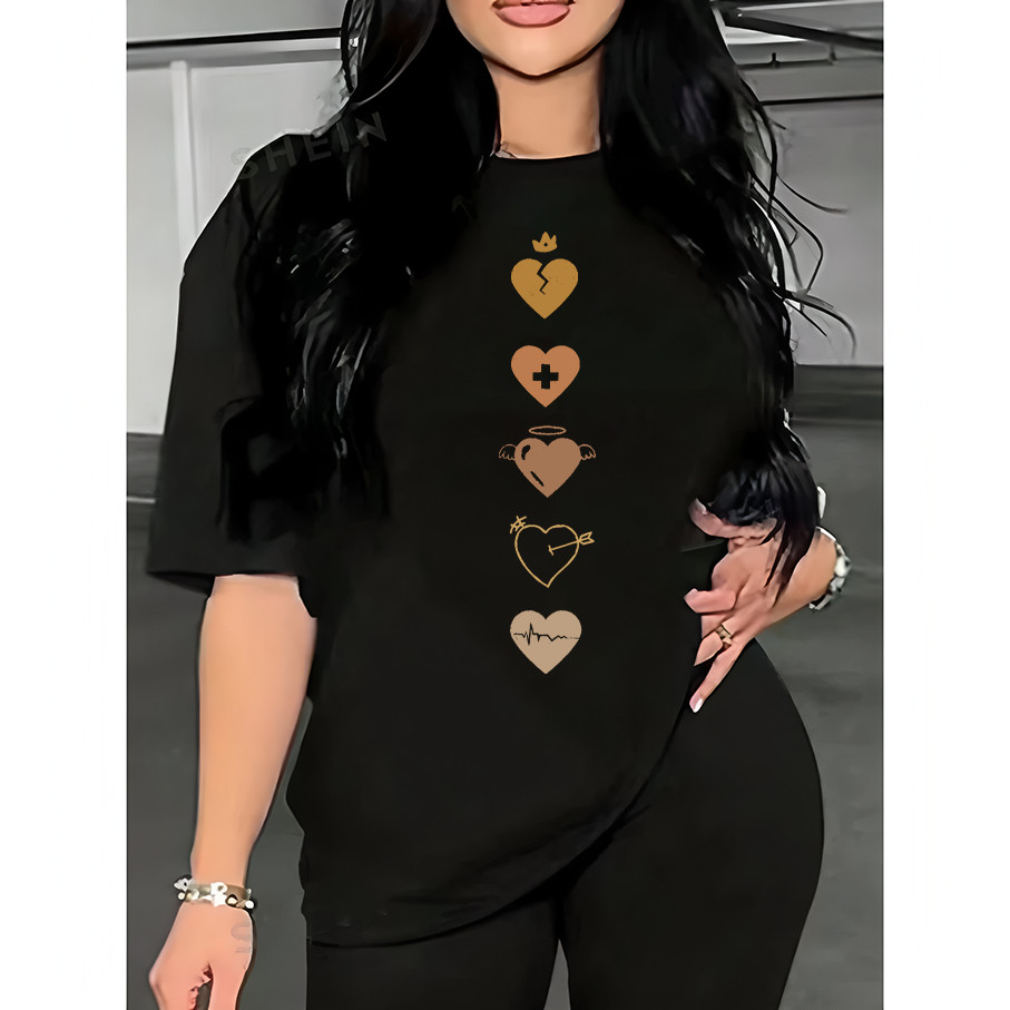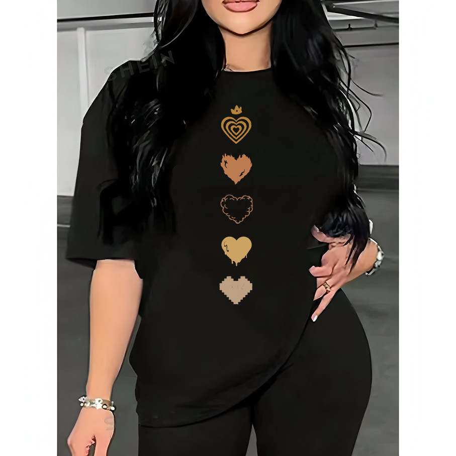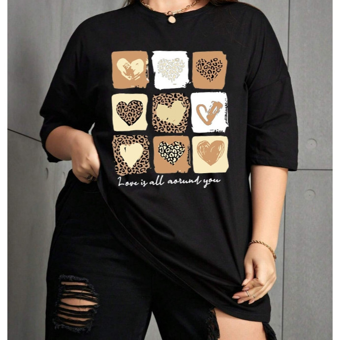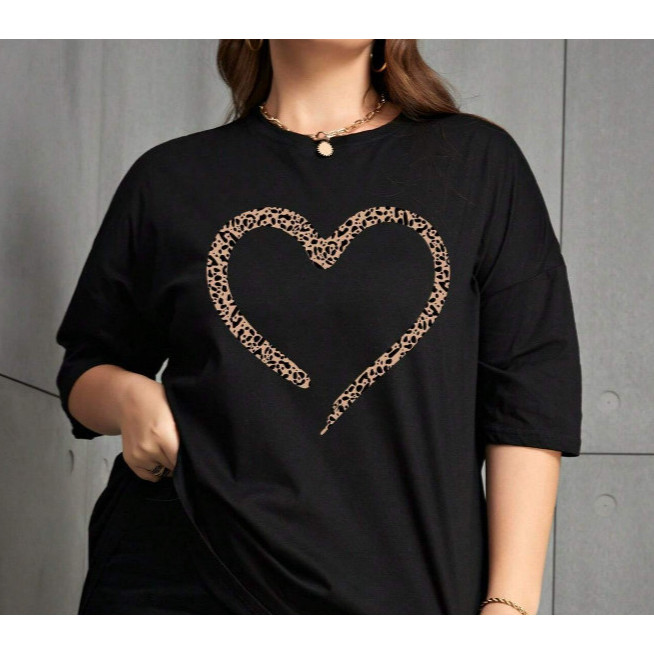 2025 Novo Camiseta Plus Size Estampa Coração Onça Oversized Manga Curta Feminino Amor Life Style Streetwear