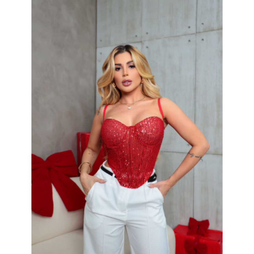 Cropped Corselet Feminino com Alças e Brilho em Tecido Paetê
