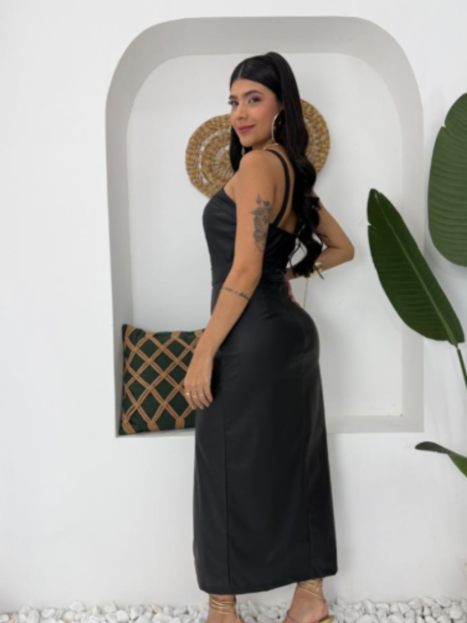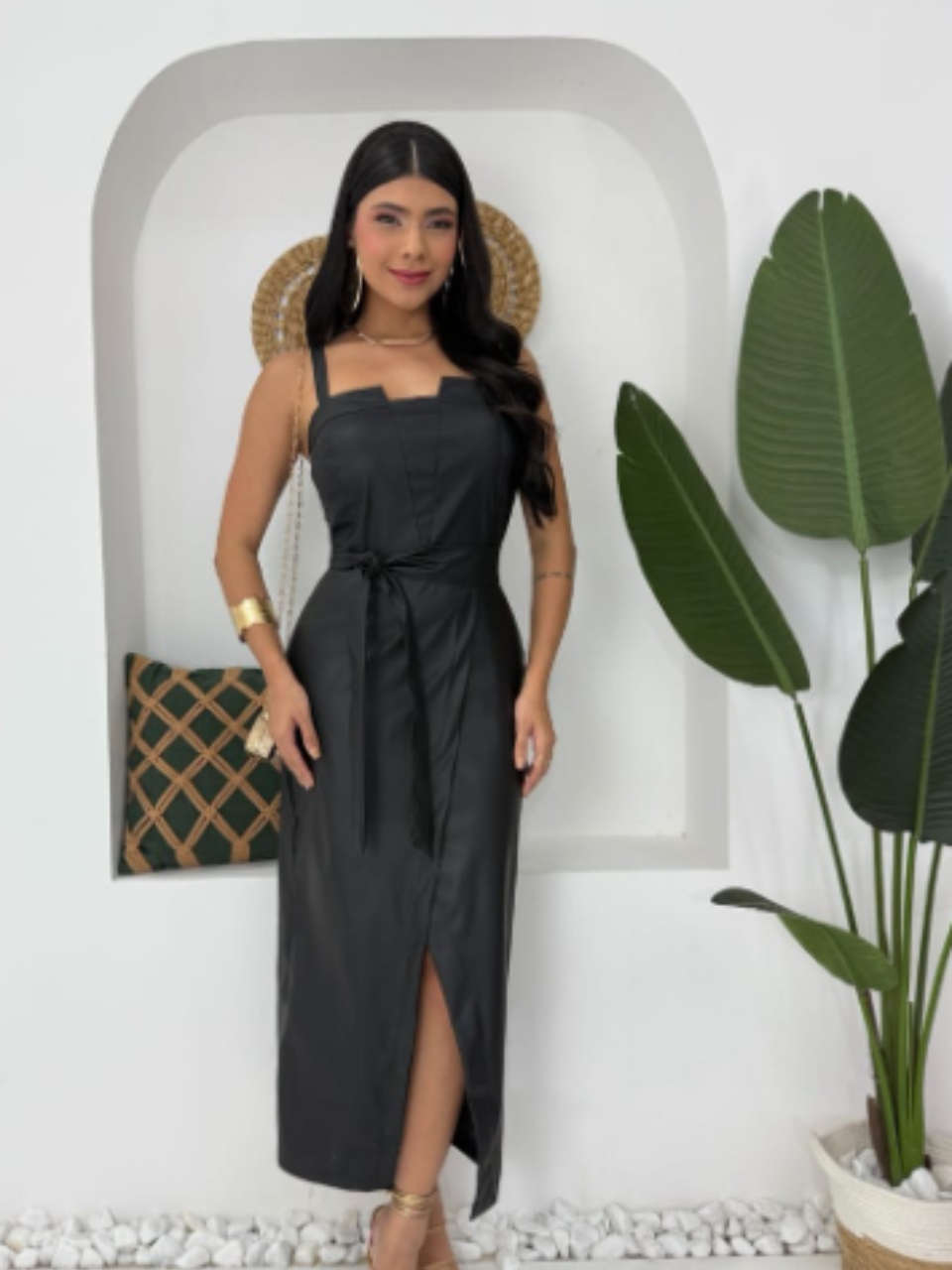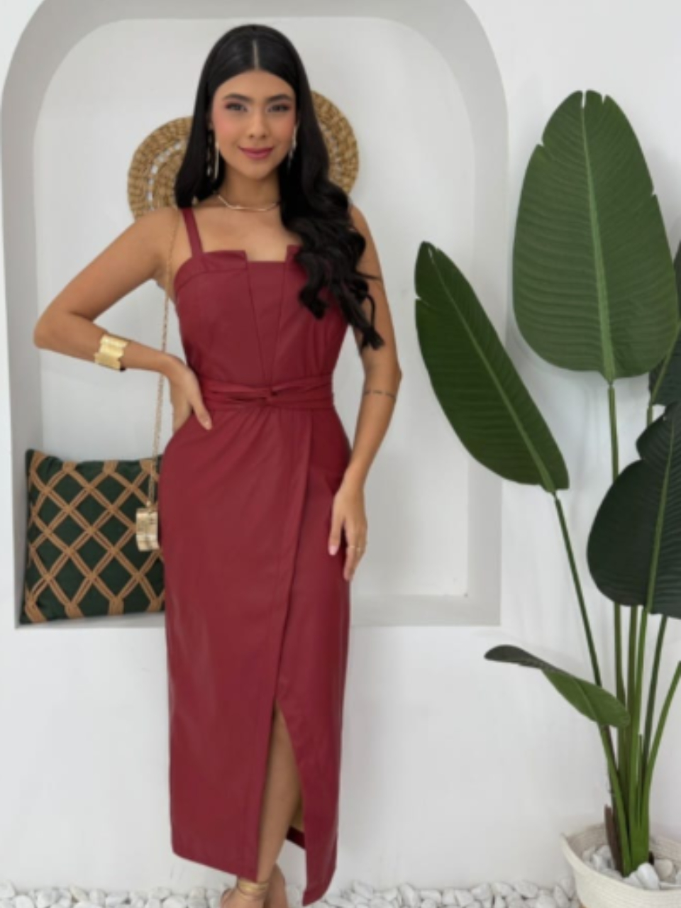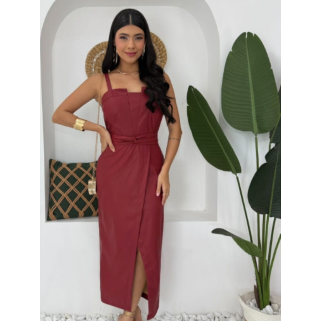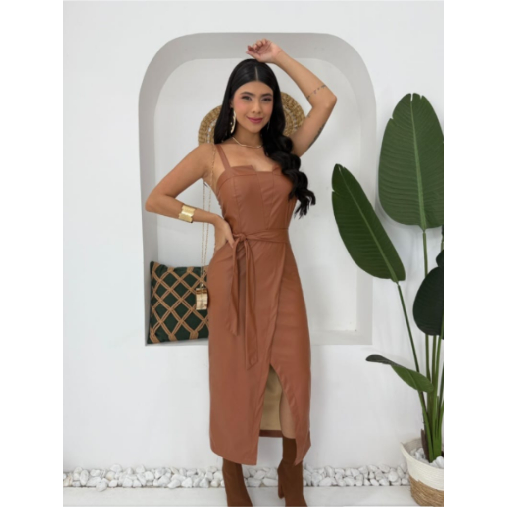 Vestido Midi Feminino em Couro Sintético com Alças Finas e Cinto na Cintura