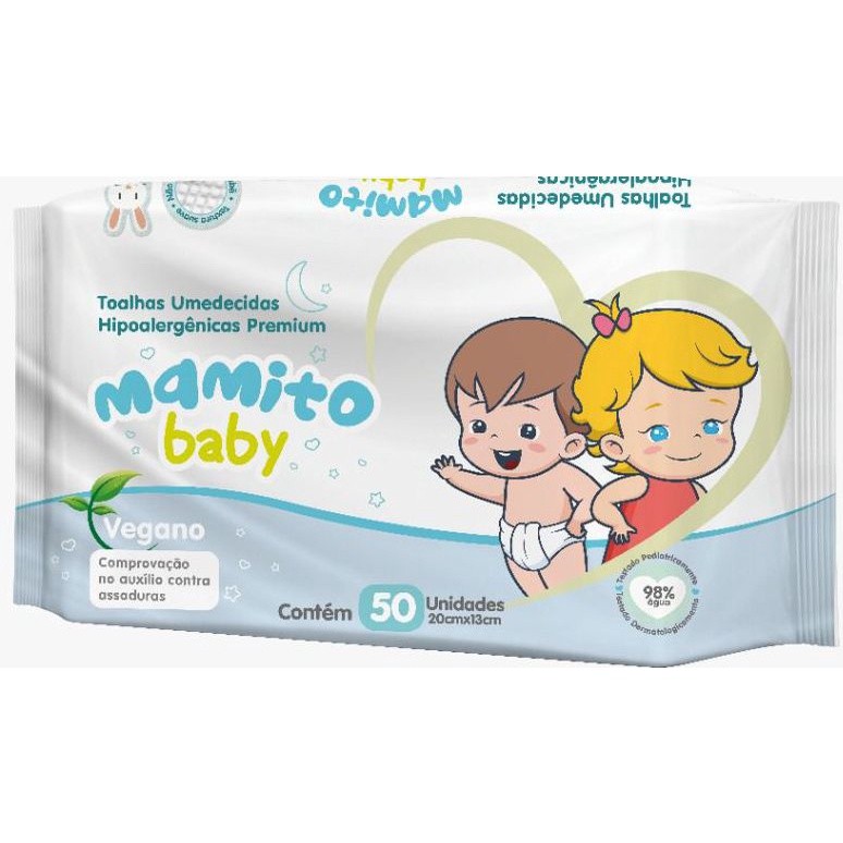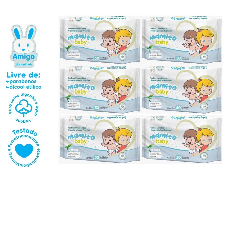 Kit com 06 Toalhas Umedecidas Mamito Baby 50 folhas - 20x13 cm - Vegano - 98% Água