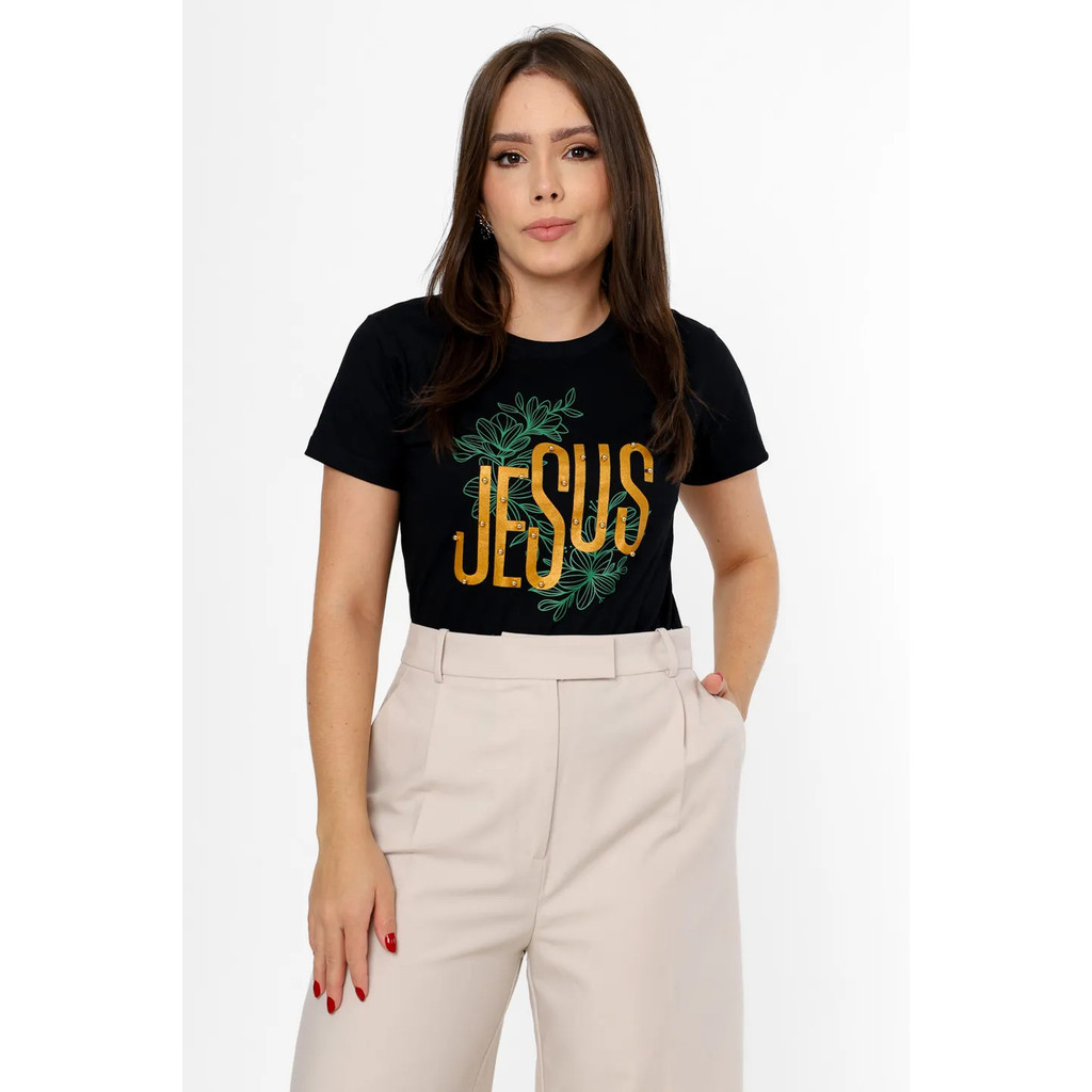 Blusa Feminina Estilosa Cristã Jesus Folhas Pérolas Blusa de Algodão