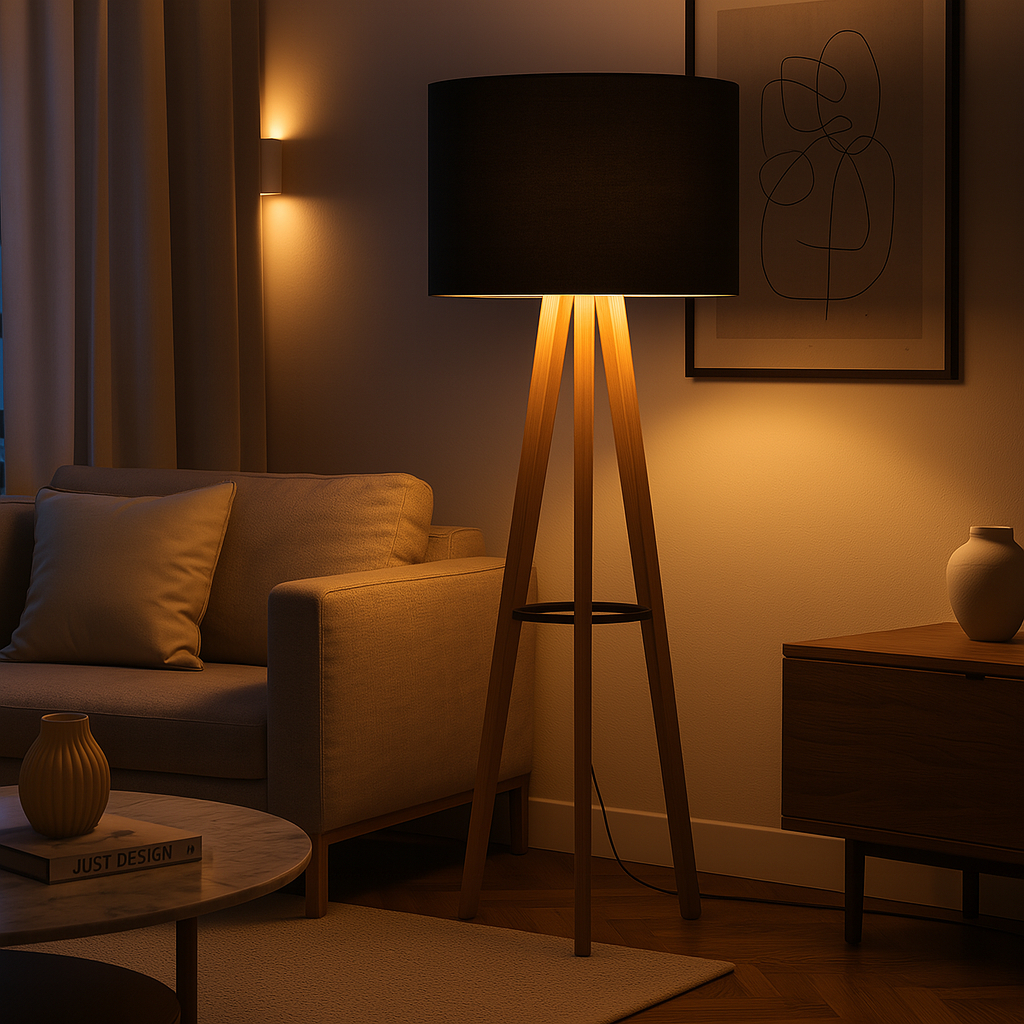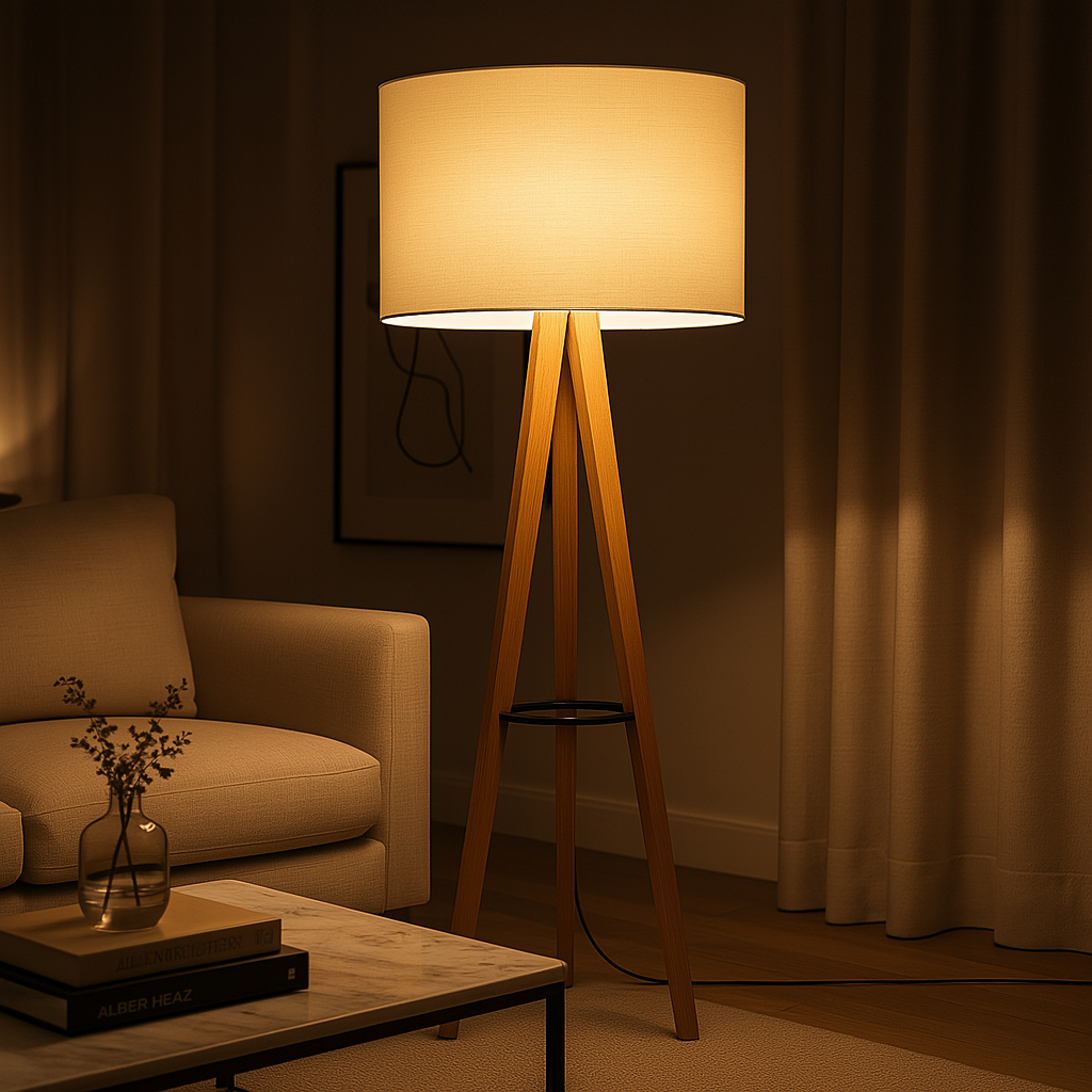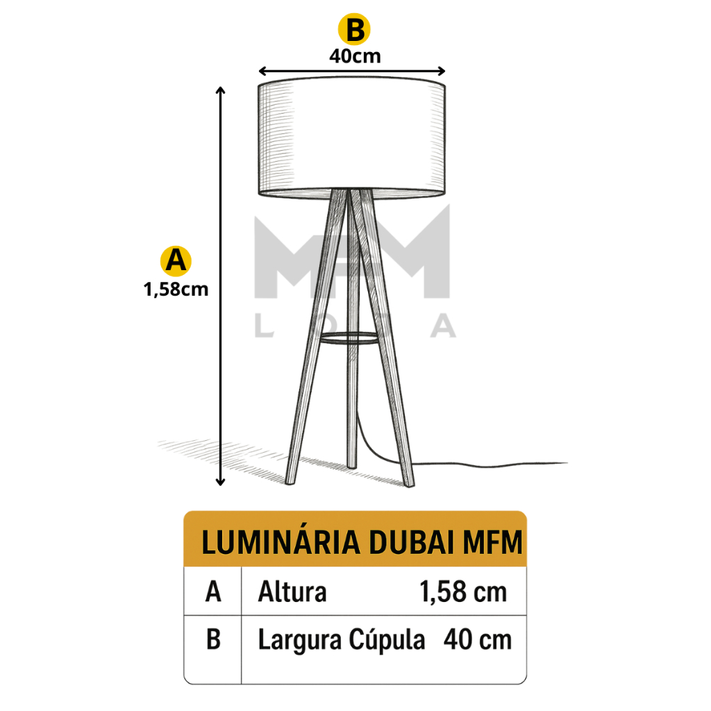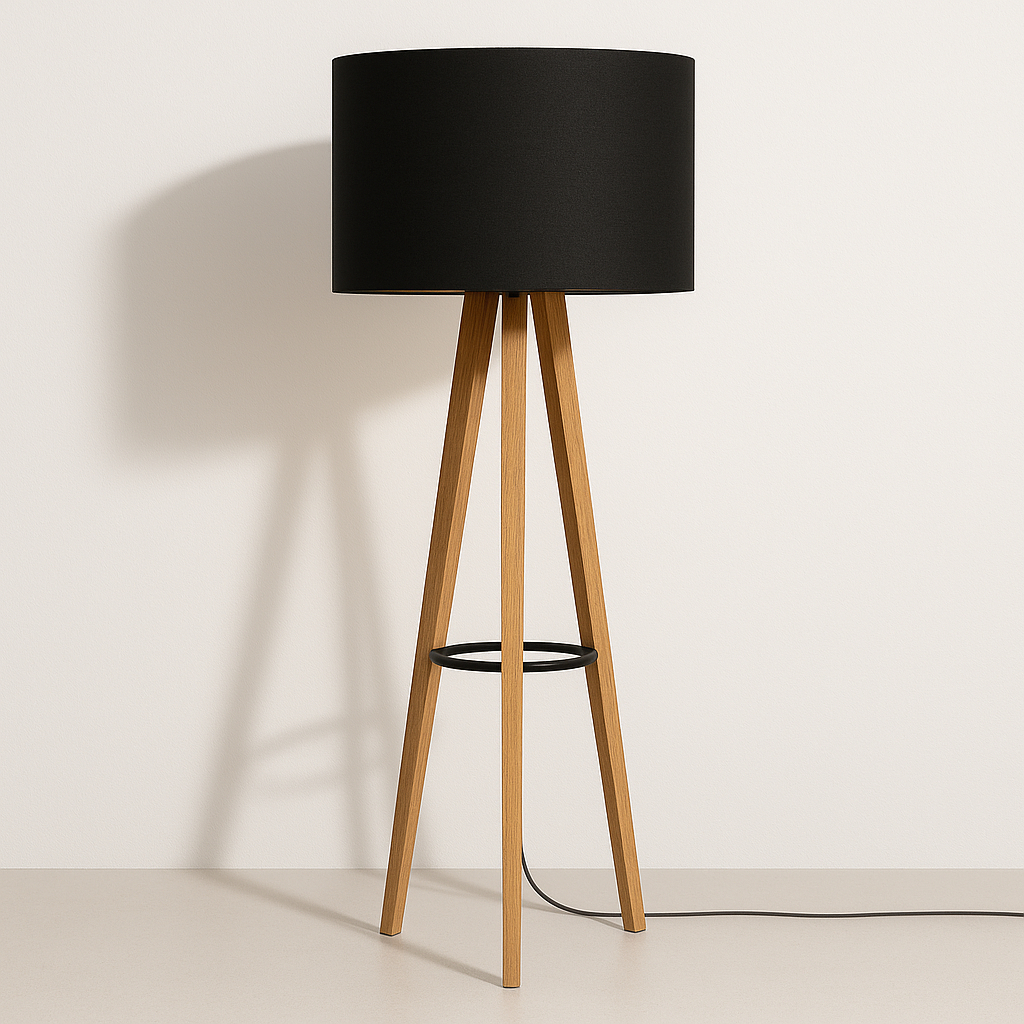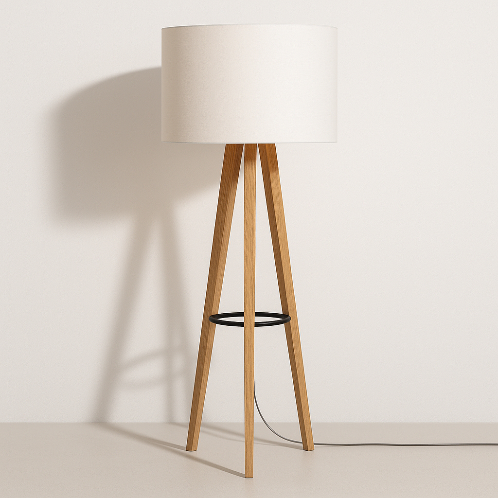 Luminária Alta de Chão Dubai – Design Tripé Madeira com Cúpula Off White