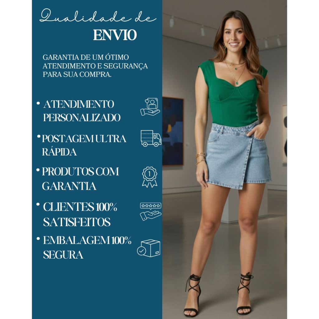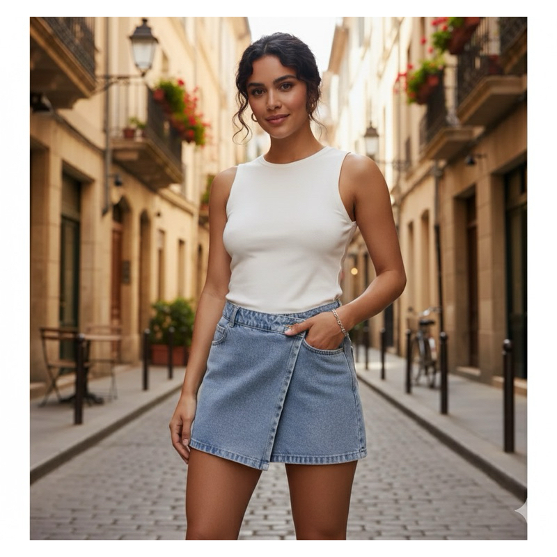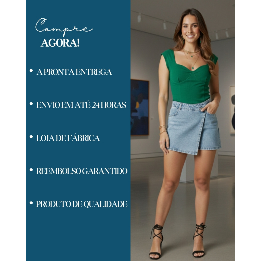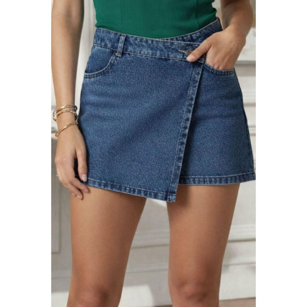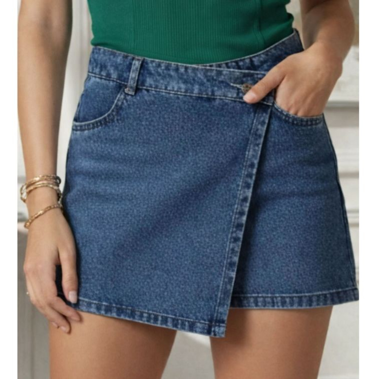Short Saia Jeans Feminino Cintura Alta com Bolso Sem Lycra Confortável e Versátil Tendência