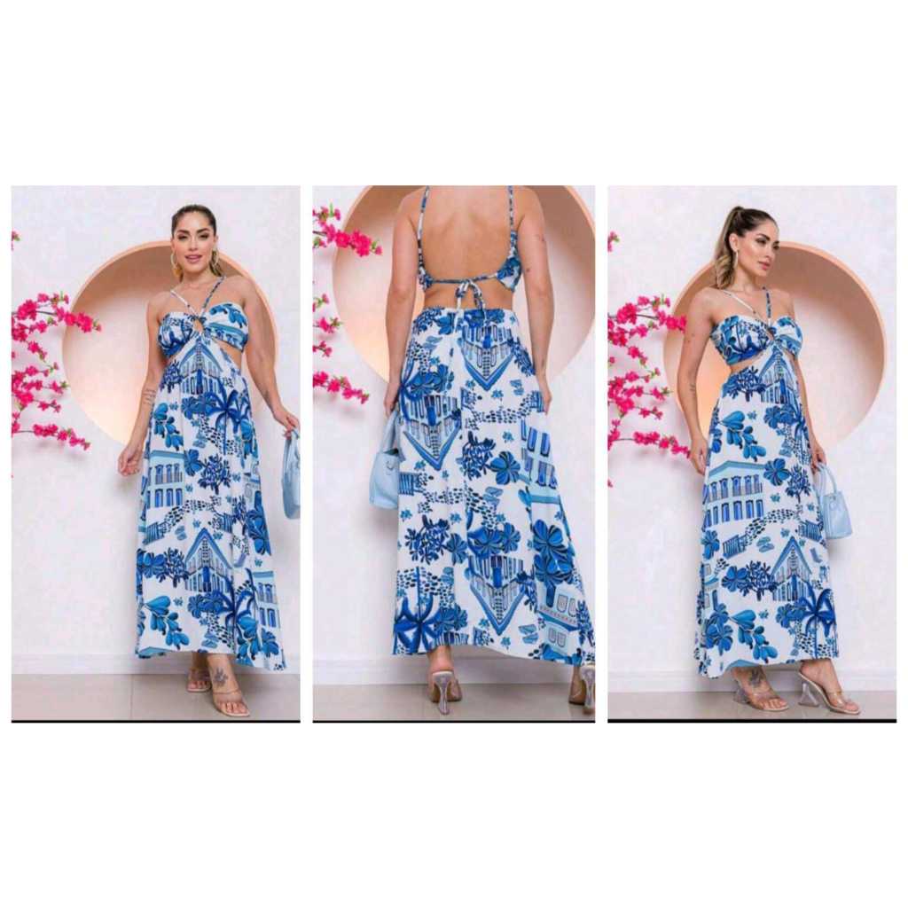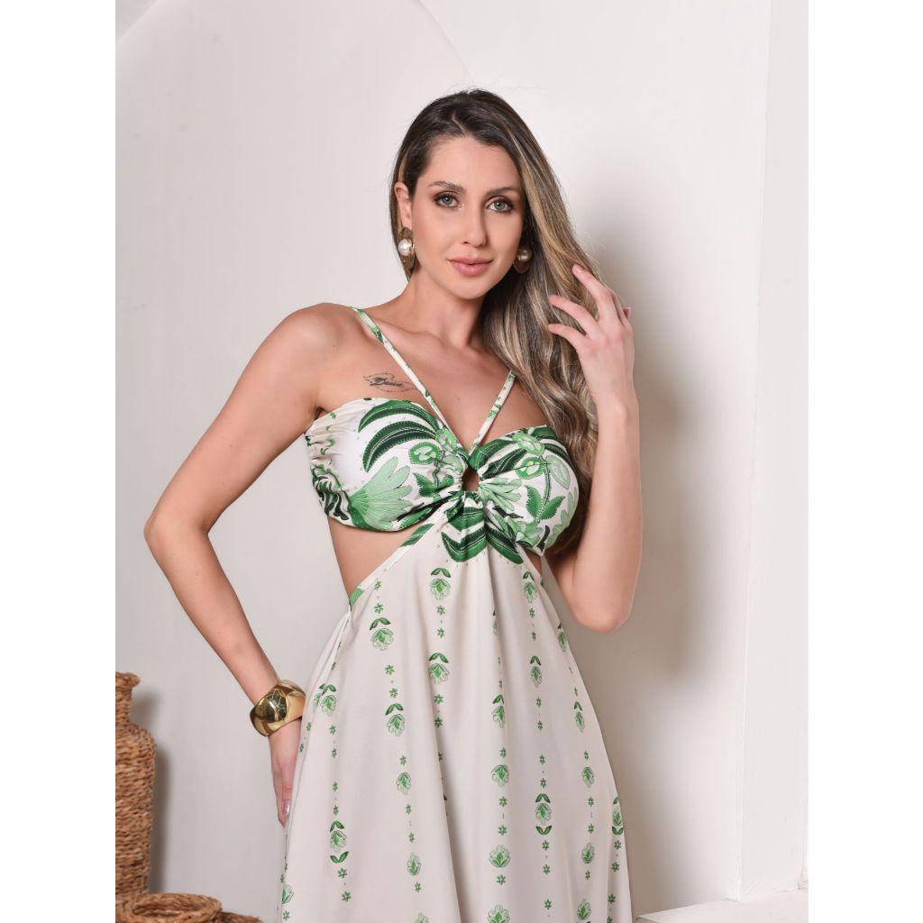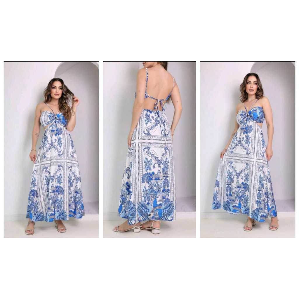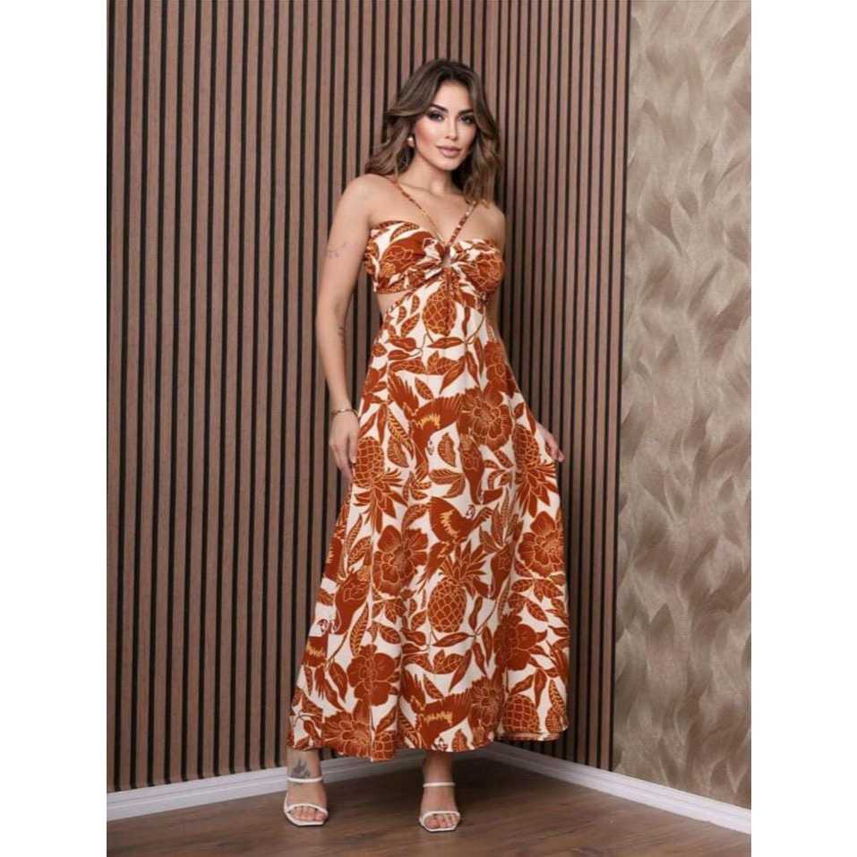 Vestido longo estampada longo alça com bojos vazado Novo Verao Moda