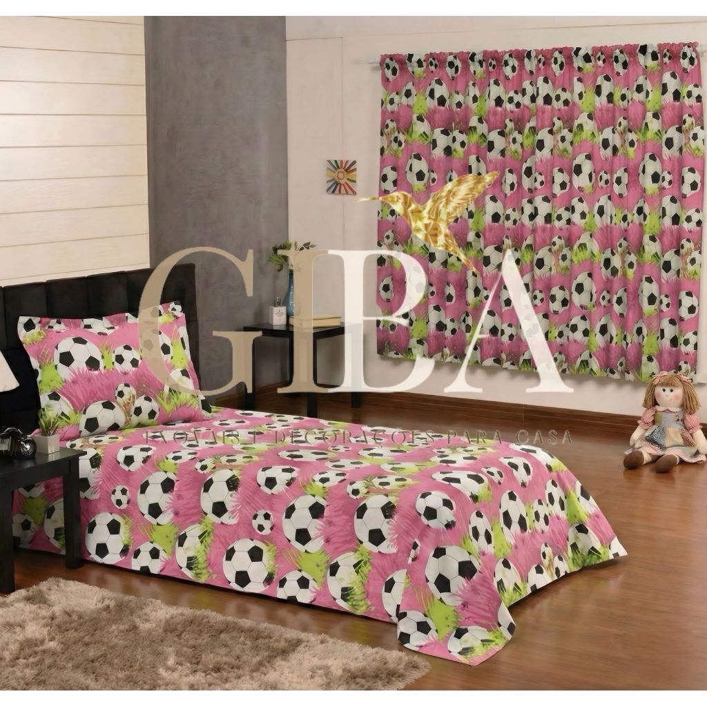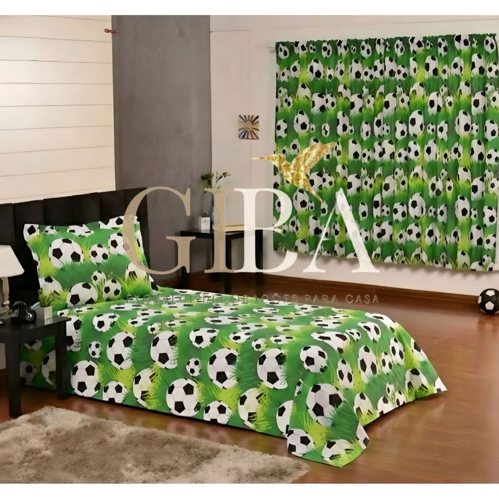 Kit Cobre Leito Solteiro + Cortina Futebol Azul Bola Estampada Jogo de Cama Infantil Menino e Menina Decoração Quarto.