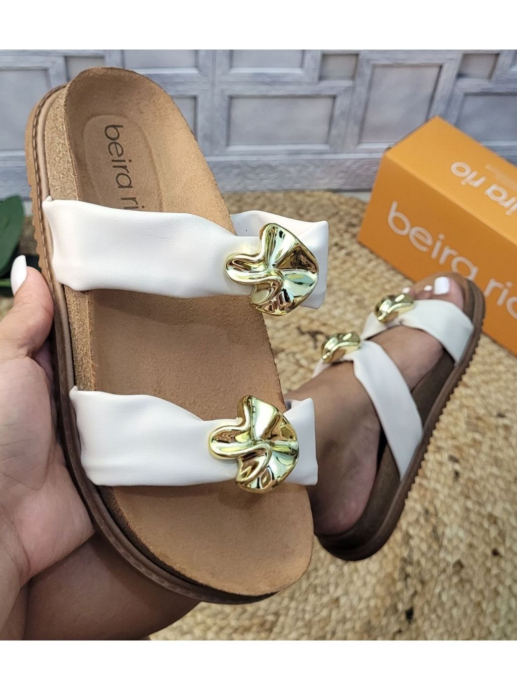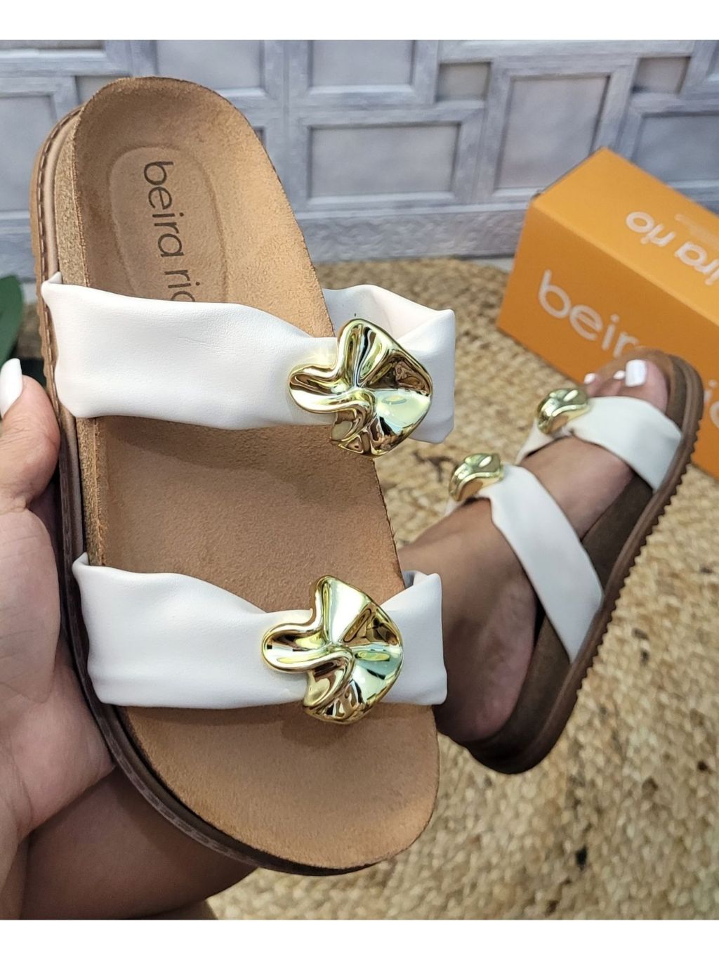 Sandália Beira Rio Feminina Rasteira Branca Enfeite Dourado