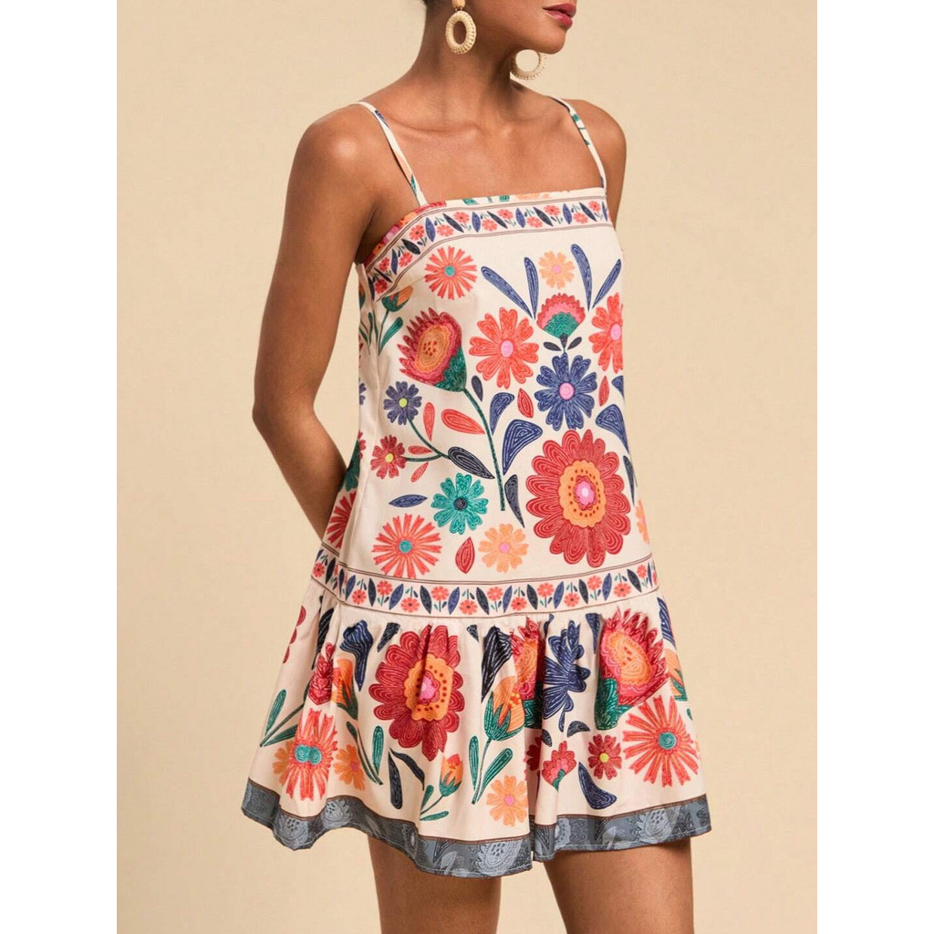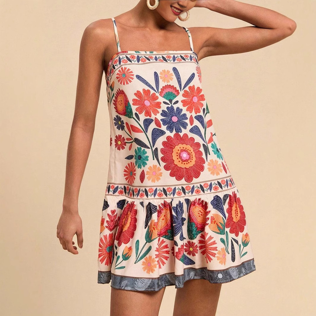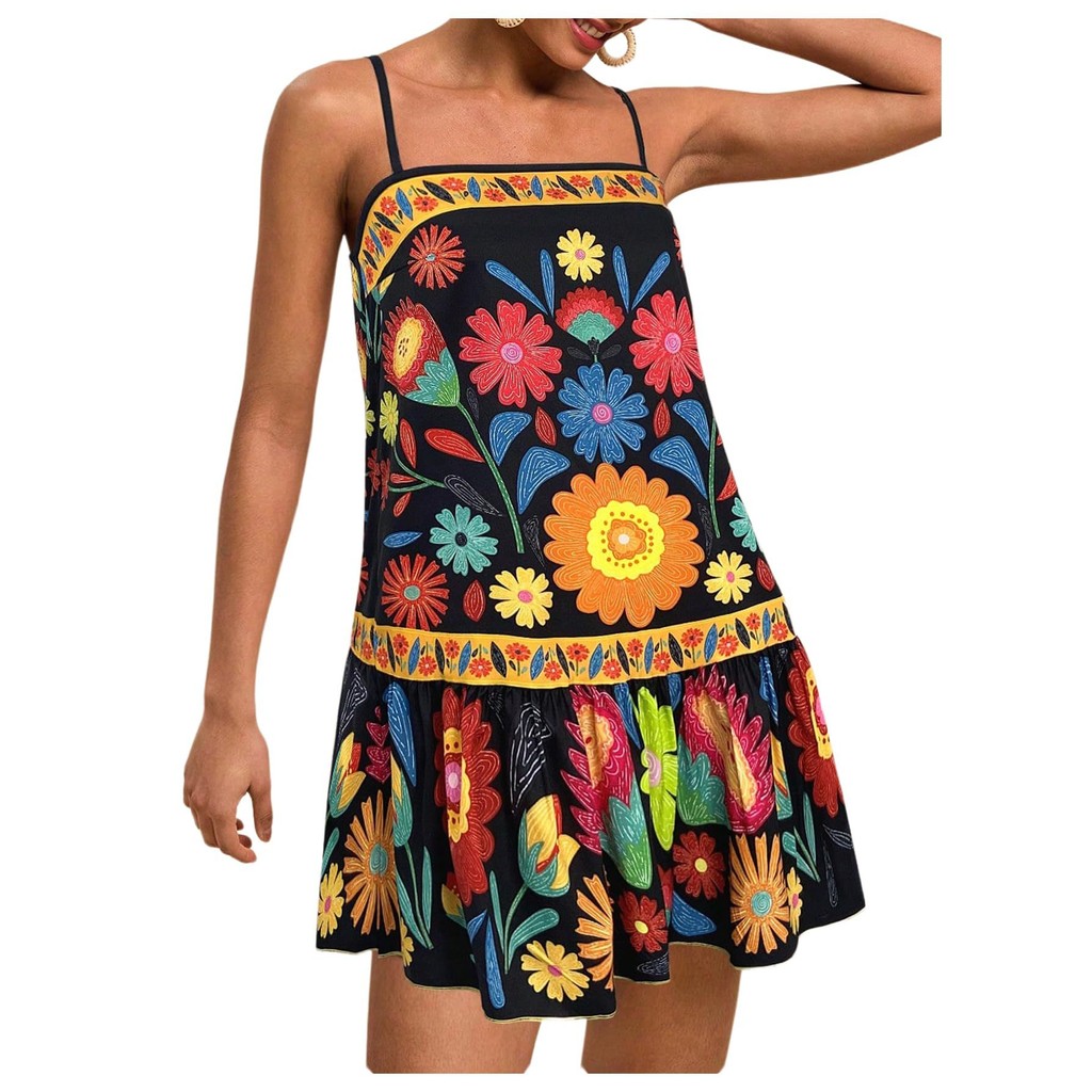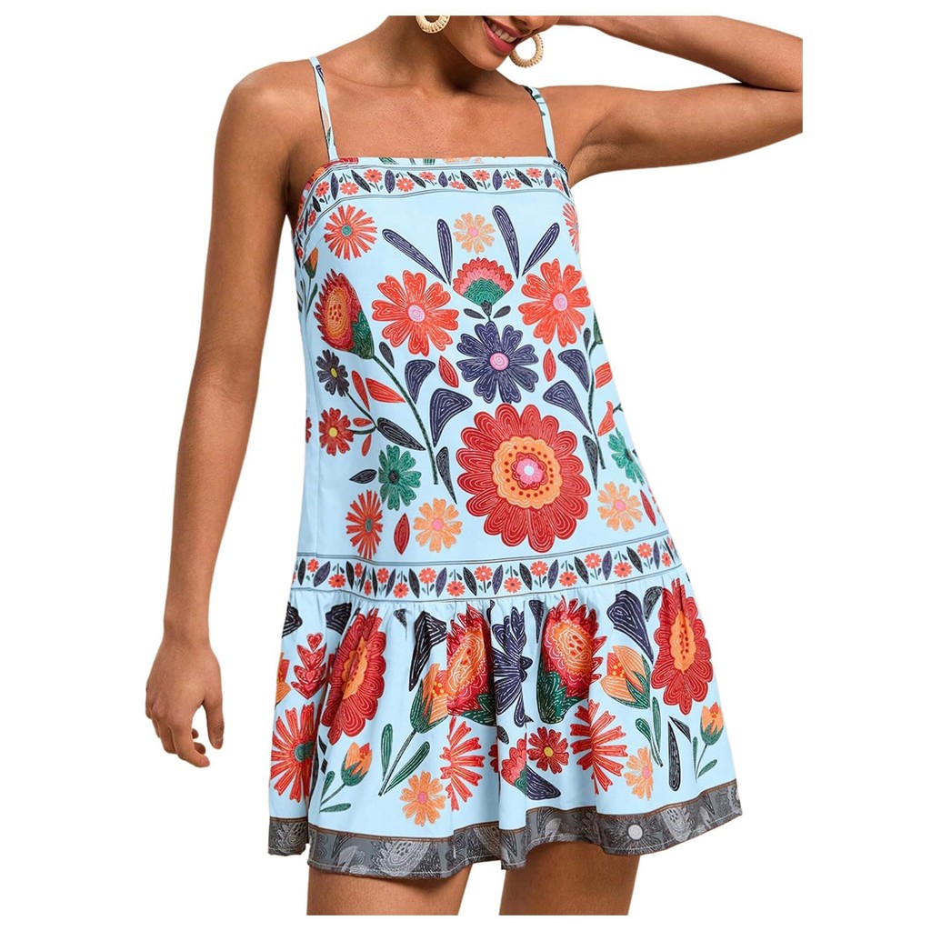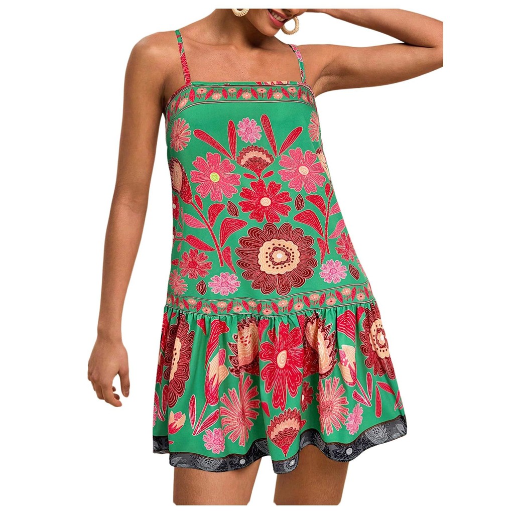 Vestido feminino de primavera e verão, vestido casual de moda, cintura alta estampado cintura