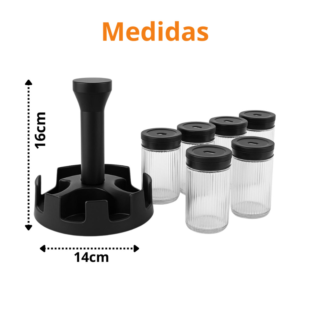 Porta Tempero Condimento Giratório com 6 Potes de Vidro 85ml com Tampa Dosadora Para Cozinha
