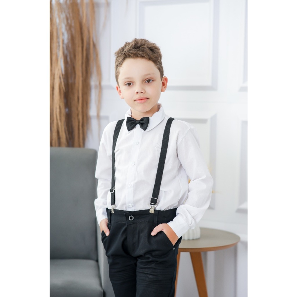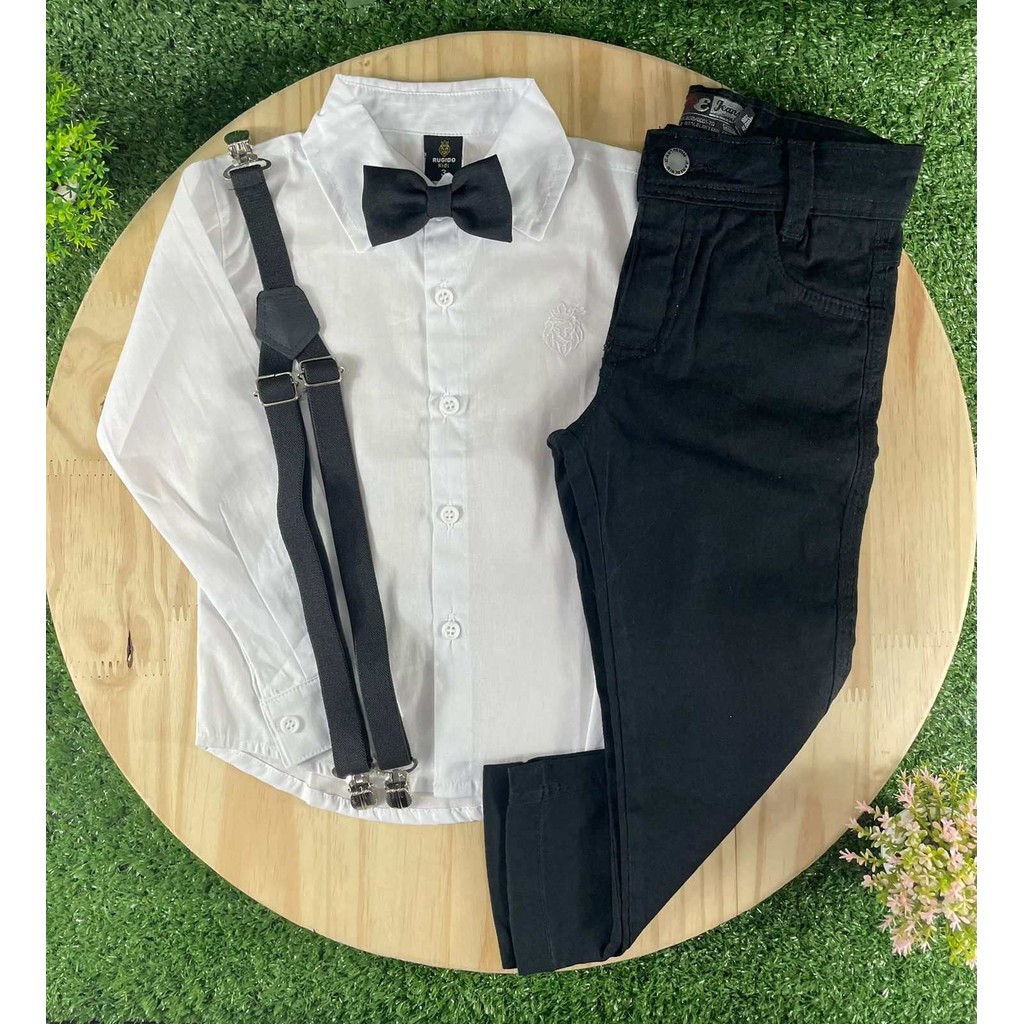 Conjunto Social Calça Preta Camisa Longa Branca Suspensório Gravata Pajem Casamento Formatura Infantil